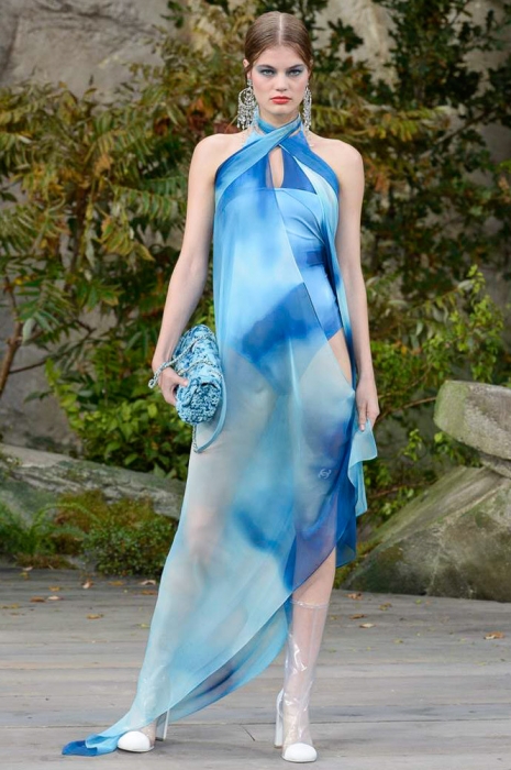 Из пластика Карл сделал даже классические сапоги Chanel c черным мысом и пяткой — в прошлом сезоне они были усыпаны стразами и сочетались с такими же блестящими колготками. Теперь в фирменной обуви можно ходить не только по ровному асфальту и паркету отеля W, но и по колдобинам российских дорог, в которые после осадков «набивается» грязь и слякоть. Универсальность обновки проверили на месте — для этого в Гран-Пале разбили настоящий гигантский водопад. Хотя после копии Эйфелевой башни и запуска ракеты привет из Ниагары не кажется нам чем-то необычным.
