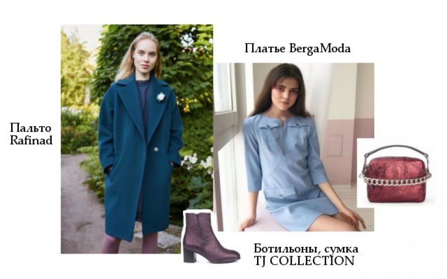 Начнем с платья цвета мартовского ясного неба от BergaModa. Утром спешим на учебу или работу, поэтому надеваем кожаные ботинки, вместительный рюкзак и теплое пальто. Мягкий шарф, прикрывающий шею, и перчатки из тонкой шерсти дополнят образ.