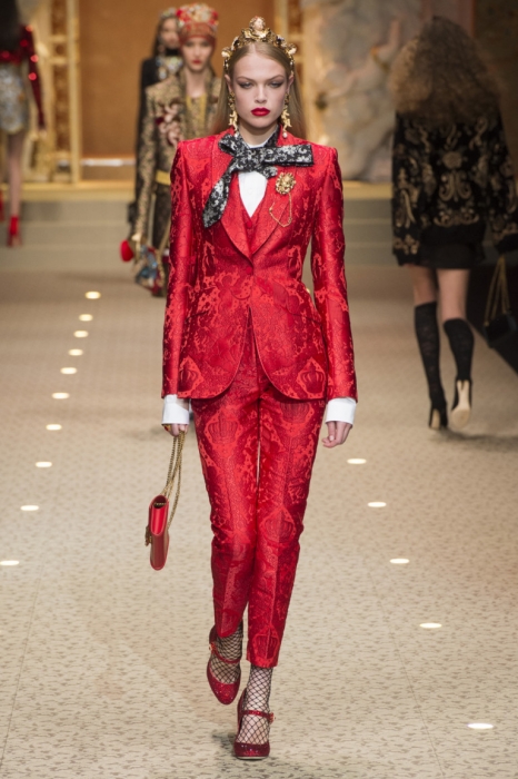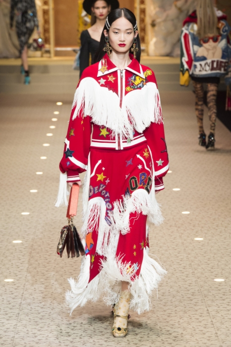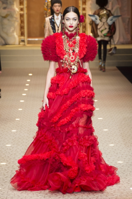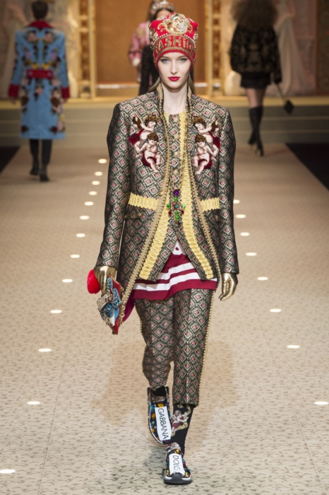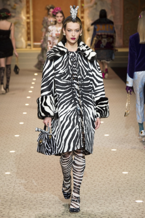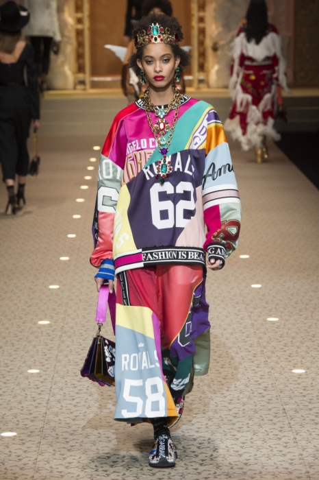 Пока одни марки дублируют головы моделей, а другие воспевают барахолки и китайские рынки, Dolce & Gabbana продолжают делать красивую одежду, в которой хочется сфотографироваться в Instagram, прийти на премьеру фильма или выйти на красную дорожку. Учитывая демократизацию дресс-кода голливудских мероприятий, новые платья с «сервировкой», кутюрные спортивные костюмы, прозрачные леопардовые колготки и разноцветная шуба в стиле пэчворк впишется в атмосферу лучше консервативного платья а-ля Грейс Келли.