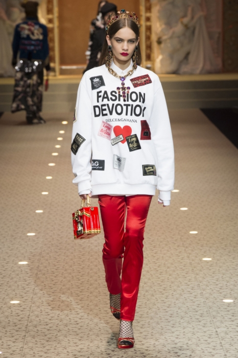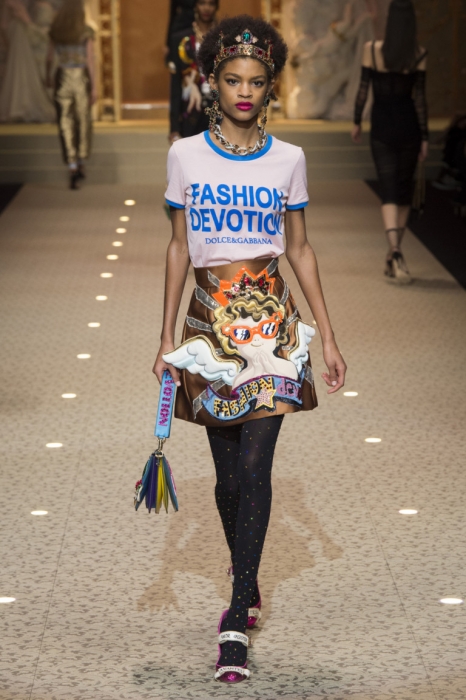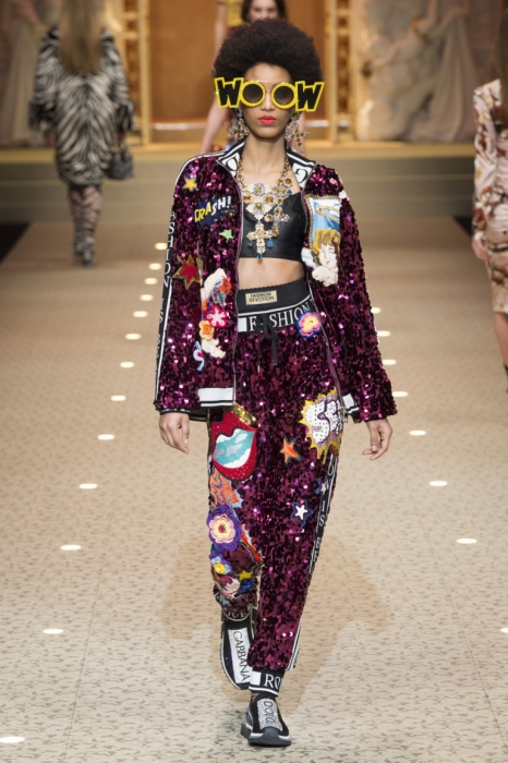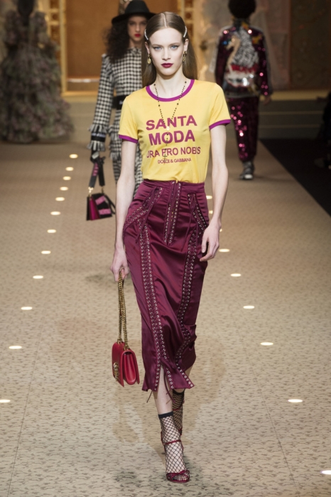 Самоирония дизайнеров Доменико Дольче и Стефано Габбана как всегда выше (и лучше) трендов. Вместо поднадоевшего брендирования на футболках появилась фраза Fashion Sinner («Модный грешник»), дополненная позолоченной сумкой-кадилом — идеальным аксессуаром к грядущему религиозному Met Gala. Роль каблуков играли фигурки с изображением основателей модного дома, а на смену «кошачьим» очкам как из «Матрицы» пришли «черепашьи» окуляры с восклицанием «WOW» и надписью «Love». Таким образом, Dolce & Gabbana добавляют к концепции «наши платья подходят всем» новую фишку — «вы можете купить у нас только один аксессуар, но все равно будете самым стильным».