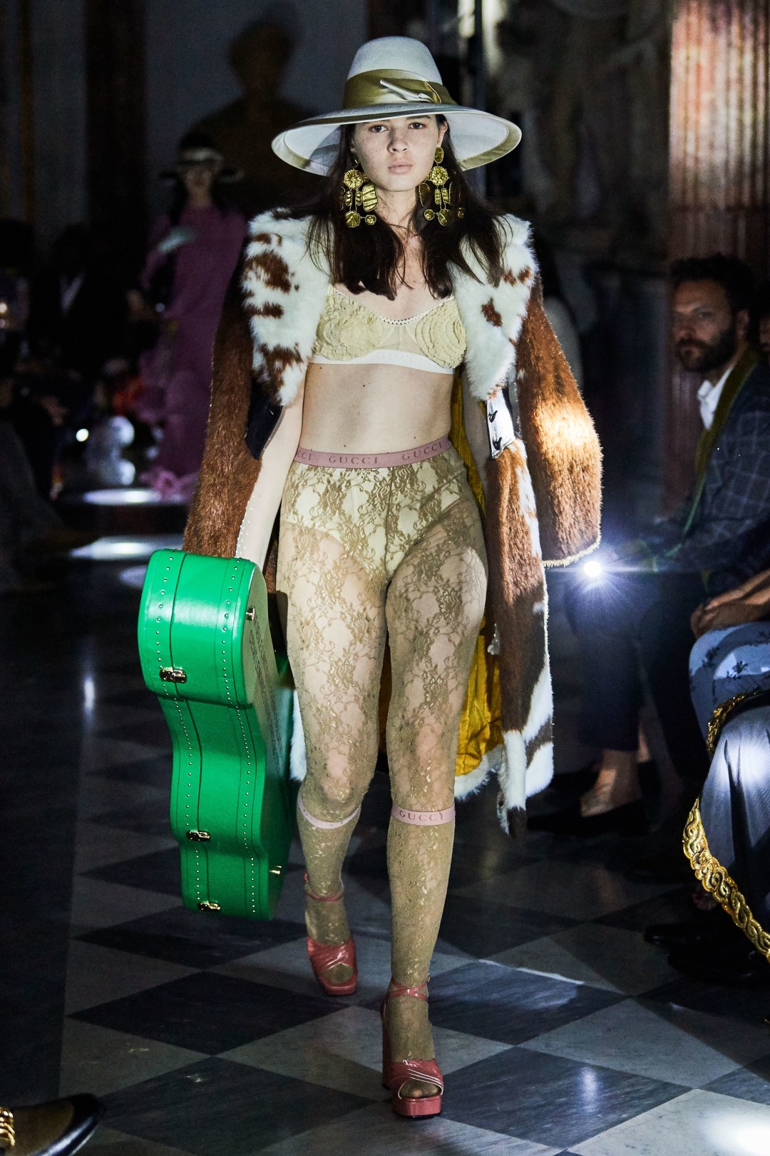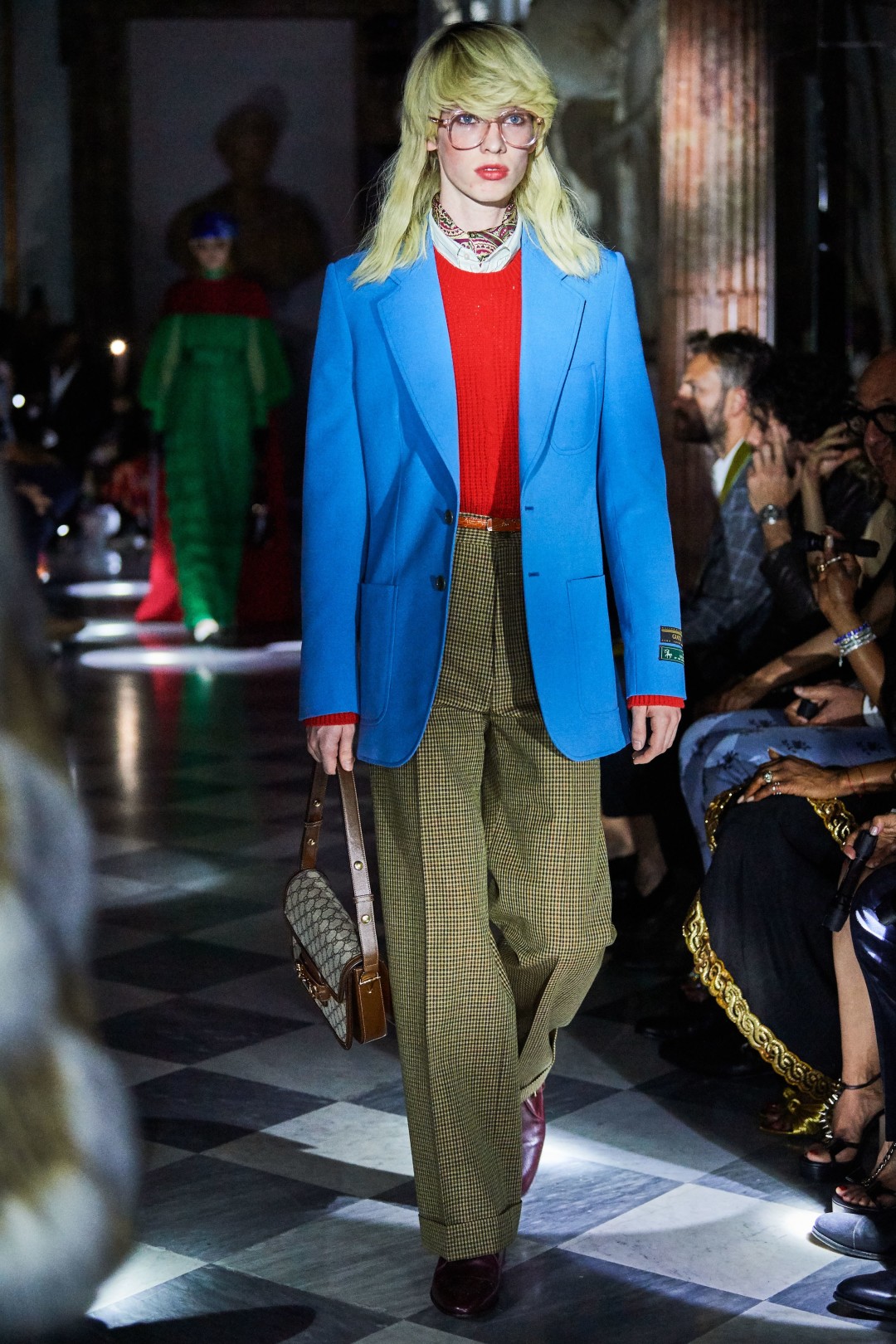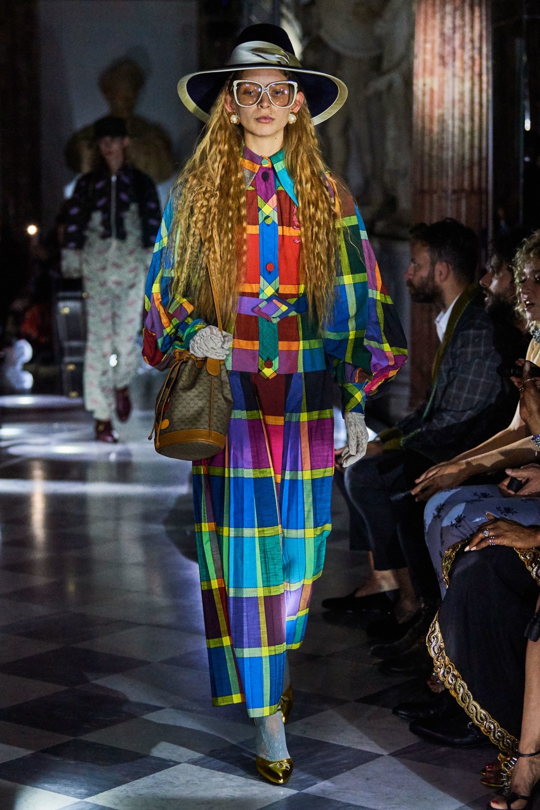 В коллекциях Gucci кэмп не заканчивается никогда: бренд, ответственный за дресс-код прошедшего в мае Бала Института костюма, устроил показ в исторических залах Капитолийских музеев в Риме, вновь перемешав разные эпохи, стили и референсы. Римские тоги стилизовали колготки с изображением Микки Мауса, а клетчатые костюмы как у молодой Синди Лопер — кейсы для музыкальных инструментов.