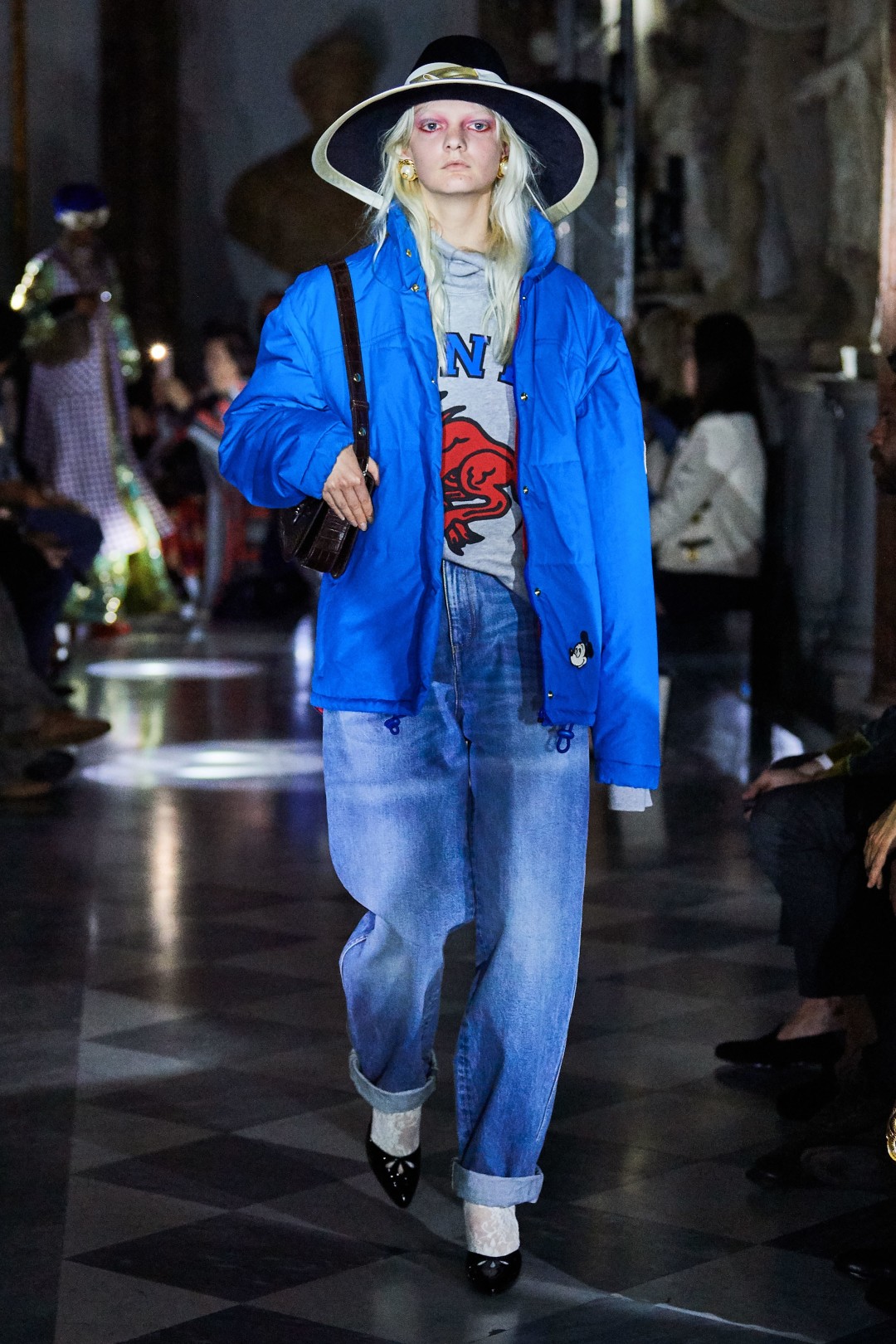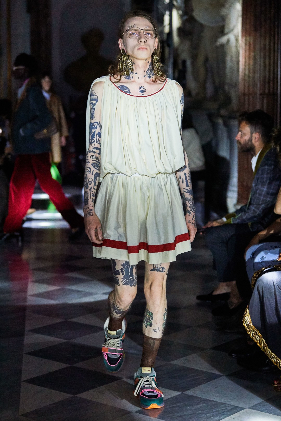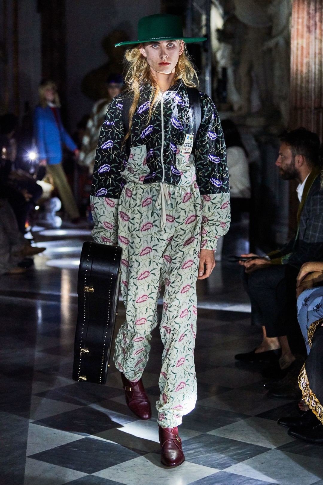 В коллекциях Gucci кэмп не заканчивается никогда: бренд, ответственный за дресс-код прошедшего в мае Бала Института костюма, устроил показ в исторических залах Капитолийских музеев в Риме, вновь перемешав разные эпохи, стили и референсы. Римские тоги стилизовали колготки с изображением Микки Мауса, а клетчатые костюмы как у молодой Синди Лопер — кейсы для музыкальных инструментов.