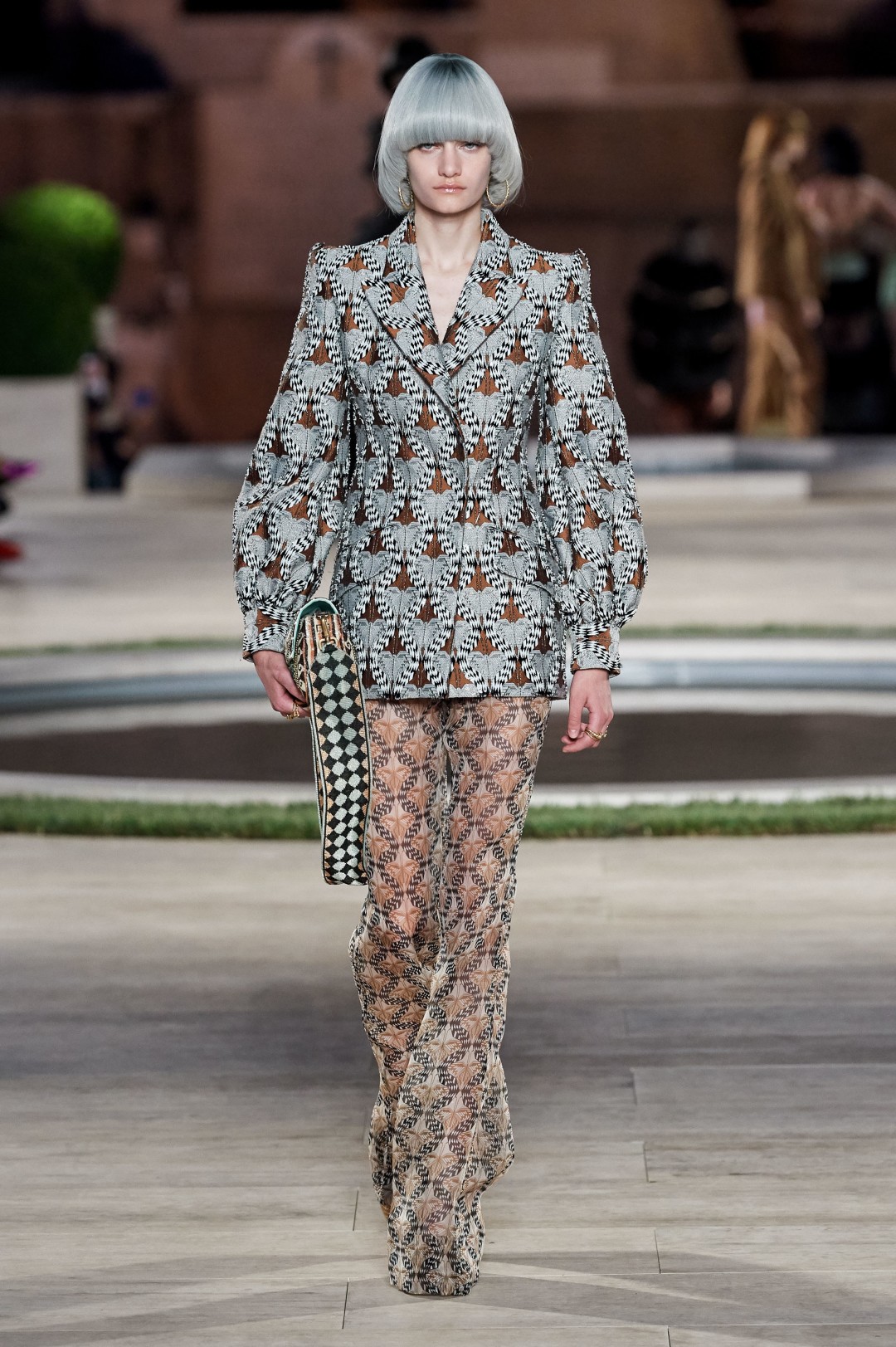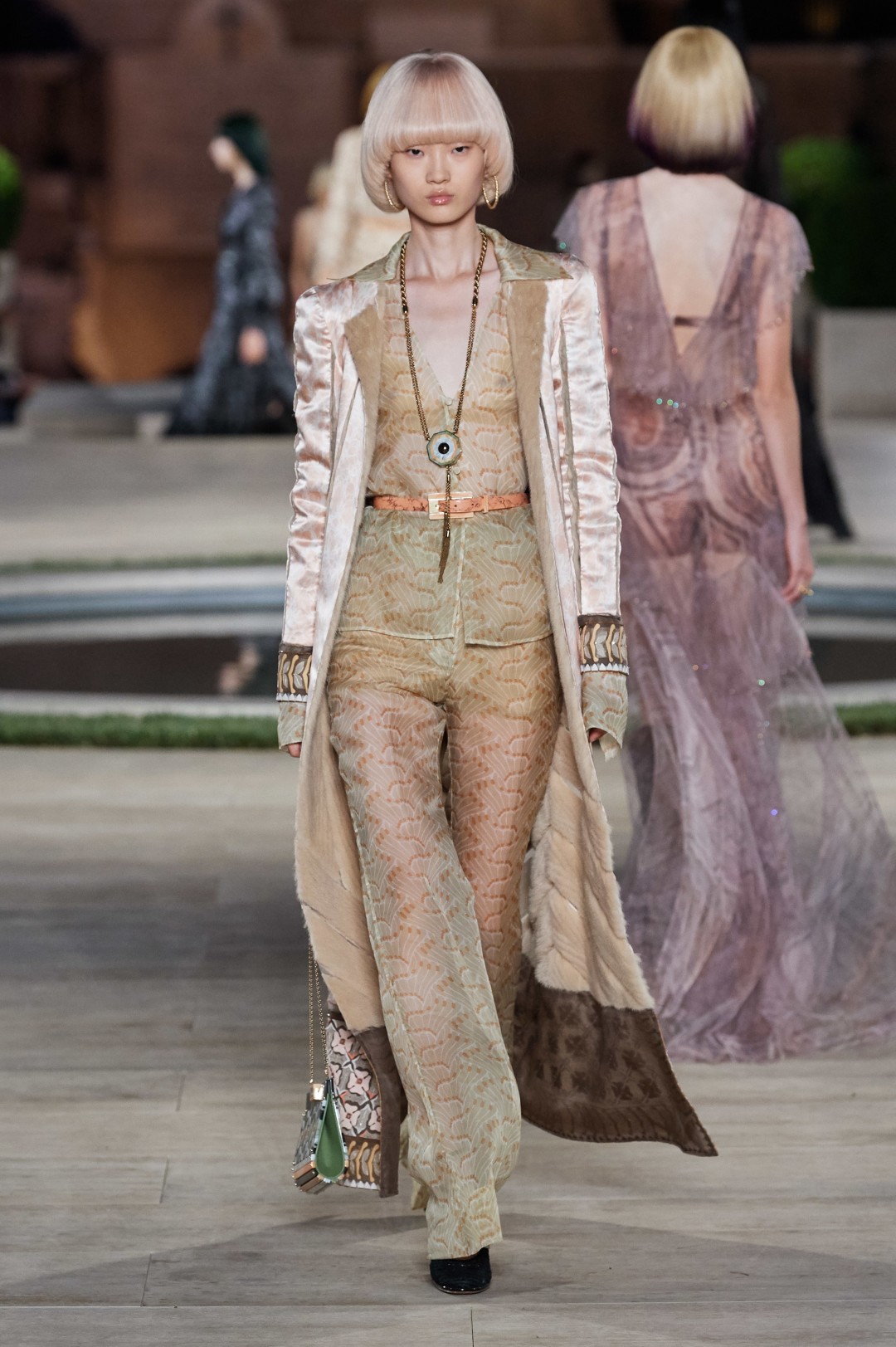 В кутюрную коллекцию, которая, по задумке Сильвии, должна была подчеркнуть почти столетнюю связь Fendi с итальянской культурой, вошли минималистичные белые костюмы, платья-пальто с меховой отделкой, полупрозрачные блузы с объемными рукавами и классические брюки с высокой талией. Большинство вещей получили принты с имитацией рисунка мрамора, витражей и итальянской плитки, которые можно увидеть в соборах Рима, Милана, Венеции и Флоренции.