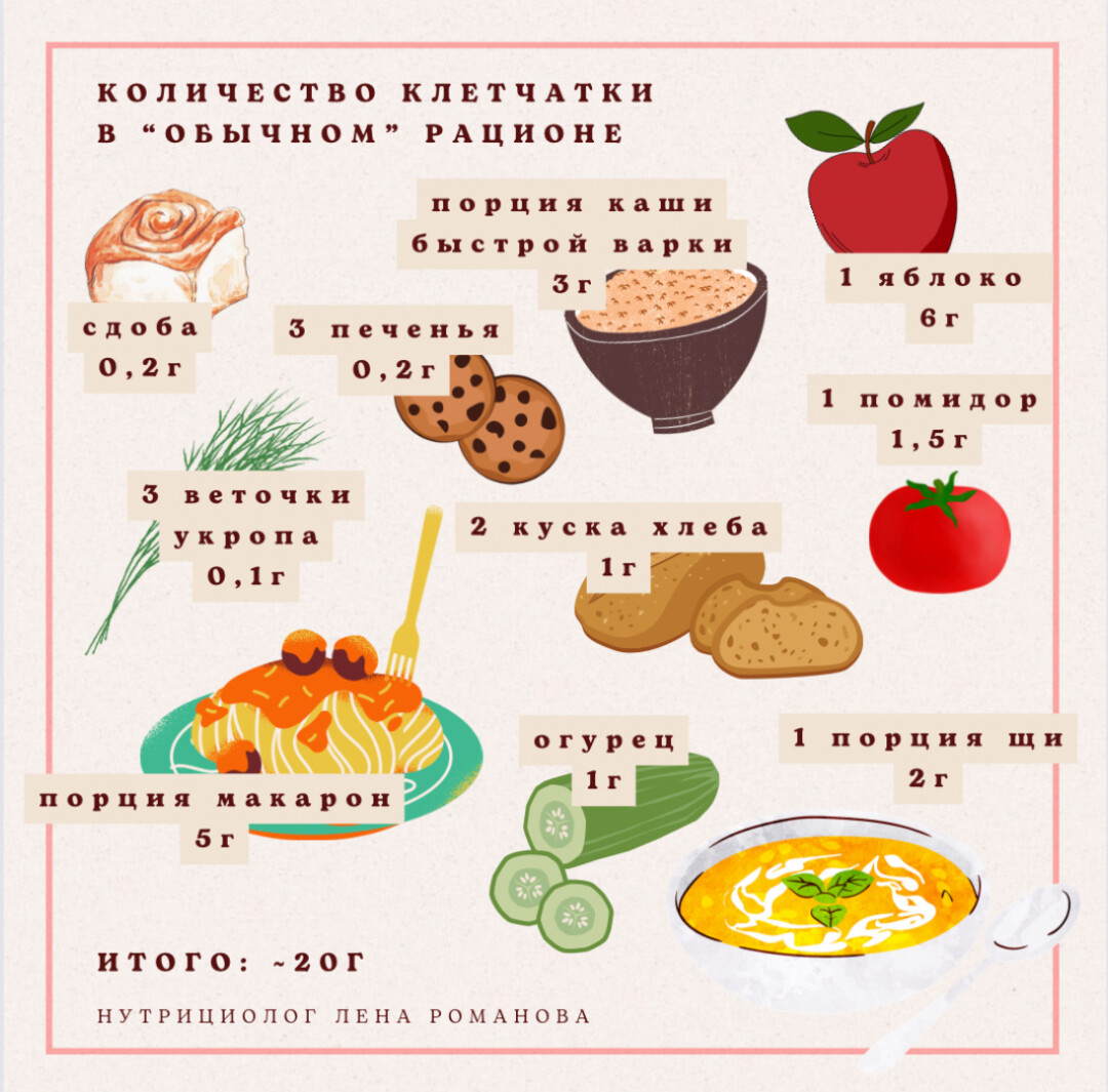 Да, чаще всего мы не получаем минимальную норму для взрослого (30 г в день), но, как правило, 20-25 г все же съедаем. Найти пищевые волокна не так сложно, они содержатся в еде, которую мы употребляем каждый день. Например, в порции спагетти примерно 5 г, в помидоре — 1,5 г, в огурце — 1 г, а в сдобной булочке — 0,2 г.