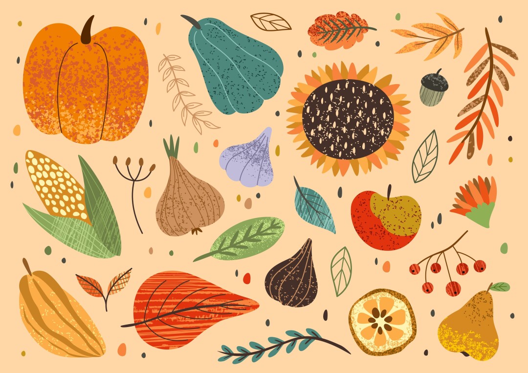 Хурма, яблоки, тыква, все виды капусты, груша, айва, болгарский перец, виноград, фасоль, кукуруза, картофель, различные кабачки, баклажаны, морковь, свекла, разные виды лука, чеснок, репа, пастернак, корень петрушки, хрен, грибы, поздний инжир, гранат, сливы, клюква, брусника, облепиха, шиповник — прекрасный выбор для осени и зимы.