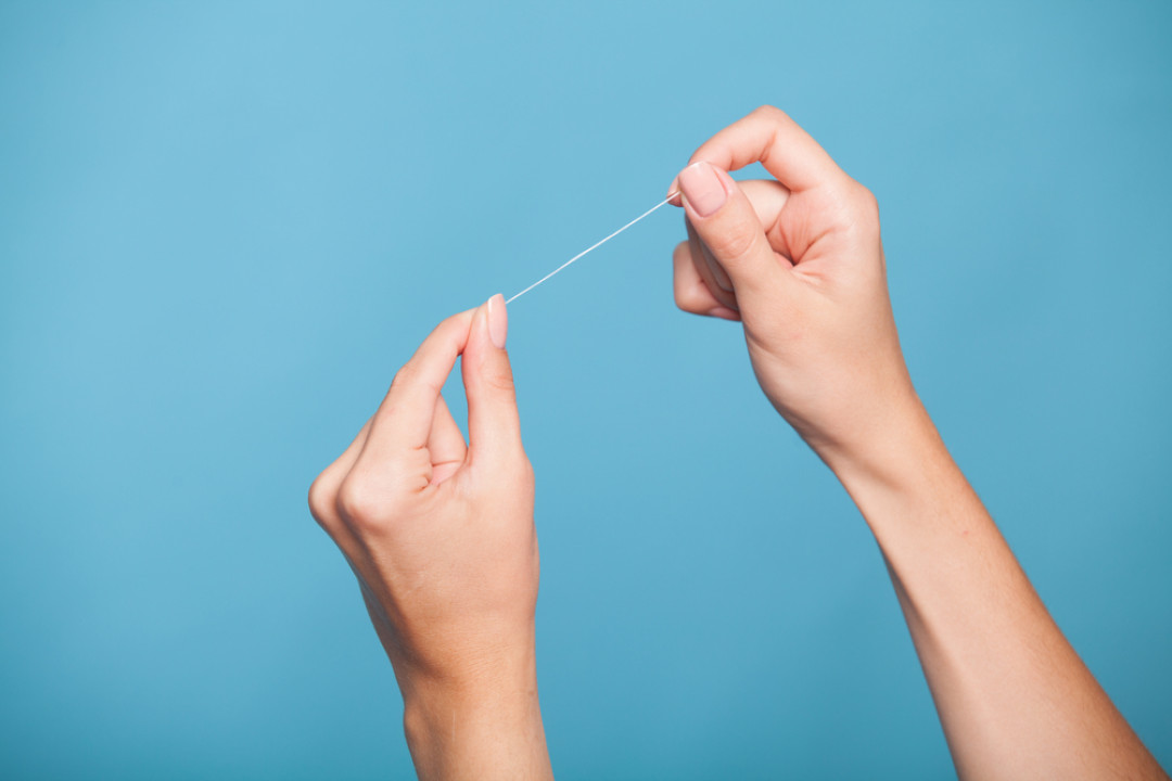 Чтобы очистить зубы нитью (или флоссом), нужно взять около 70–80 см и обмотать её концы вокруг средних пальцев. Чтобы не травмировать десну, необходимо ввести нить в межзубный промежуток по поверхности одного из зубов до уровня десны. Нить обводится вокруг зуба (будто обнимает его!) и выводится из межзубного промежутка. Далее движение повторяется в этом же межзубном промежутке, но уже по поверхности другого зуба.