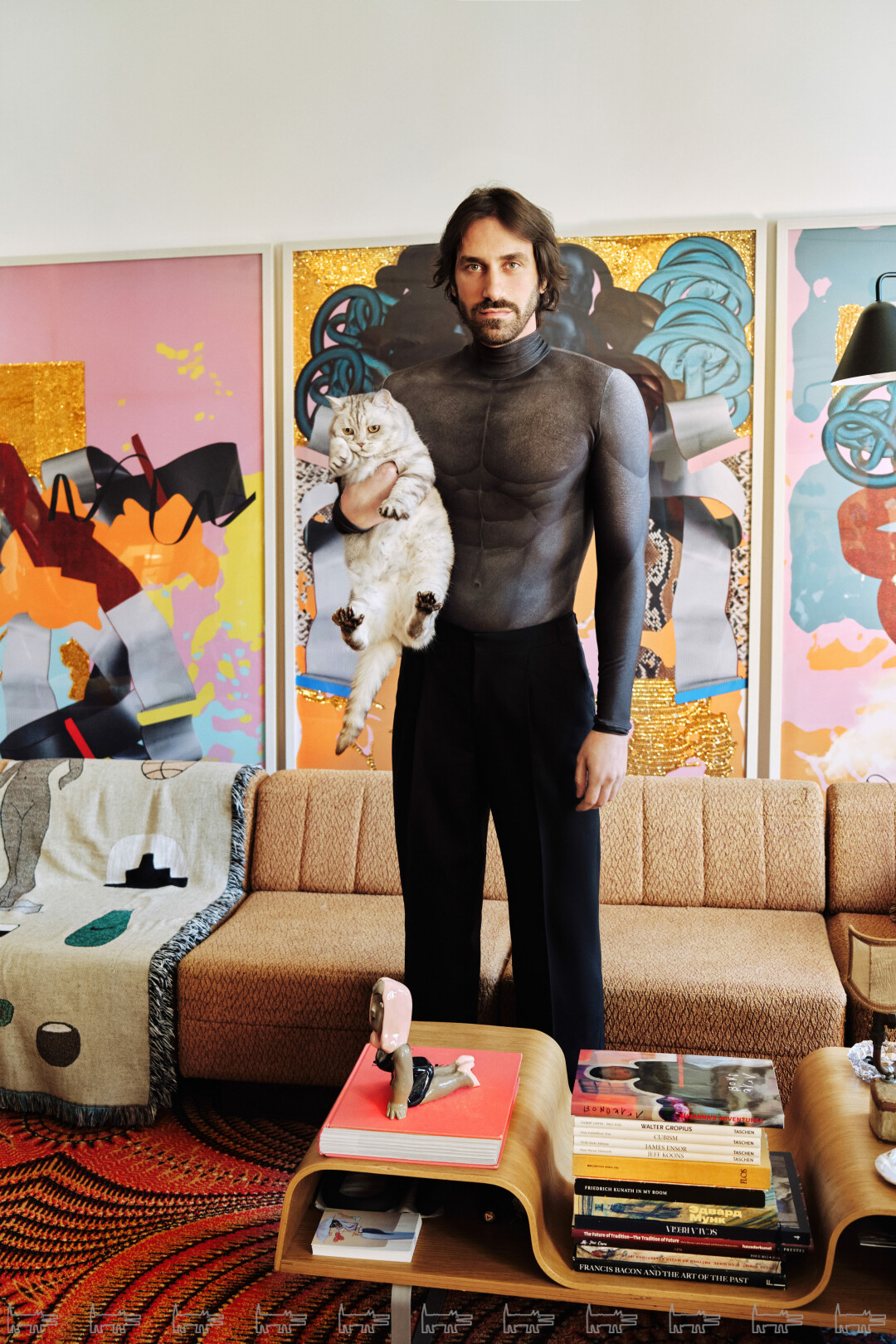 Недавно я стал работать с бронзой, но сделать из нее что-то большое нереально, потому что стоить будет как самолет (и весить так же!). Тогда я попробовал стеклопластику и родилась «Жа Жа» — оммаж актрисе и светской диве Жа Же Габор. Эта скульптура с выдающимися формами может быть матово-белой или покрытой разноцветной эмалью и лаком. У меня живут уже три, а скоро приедет стеклянный журнальный столик, основанием для которого стала «Жа Жа коленопреклоненная» — он сделан по мотивам скандальной работы 1969 года британского поп-арт художника Аллена Джонса.