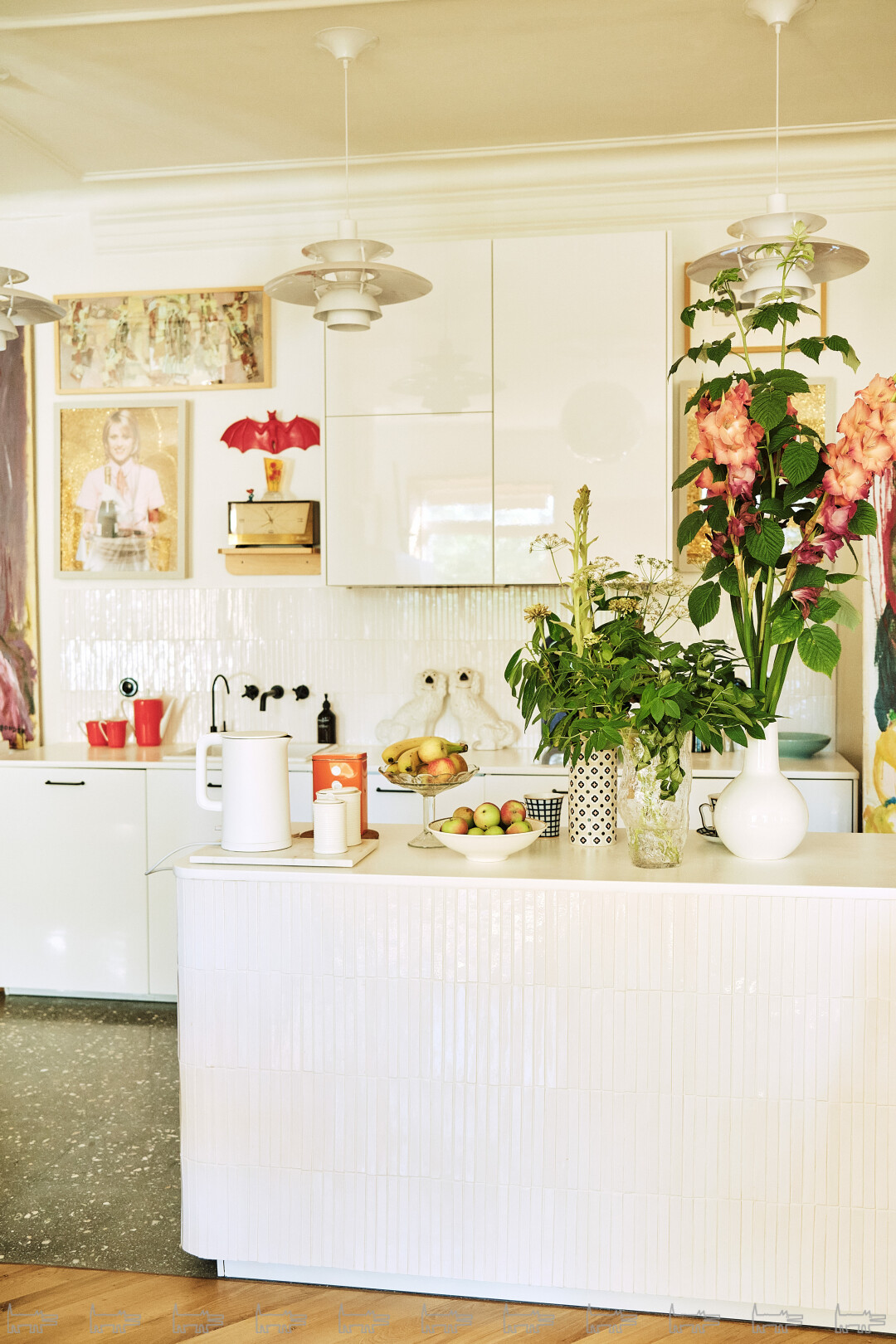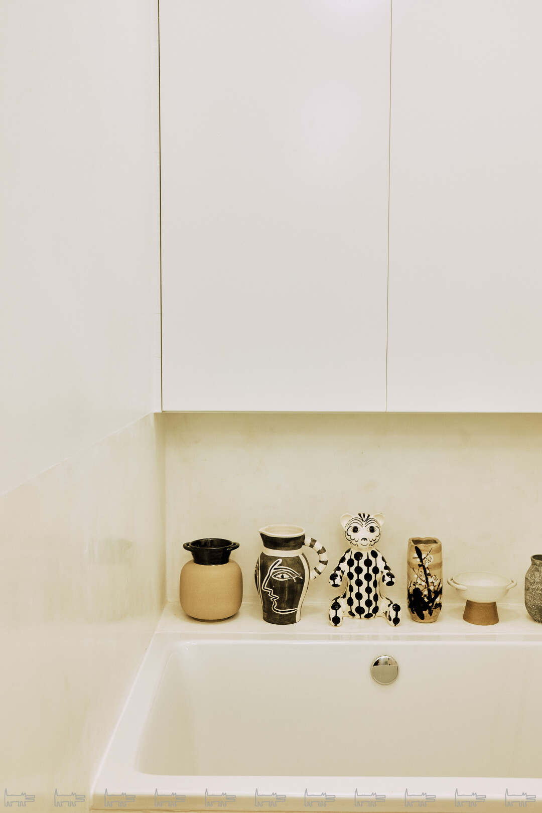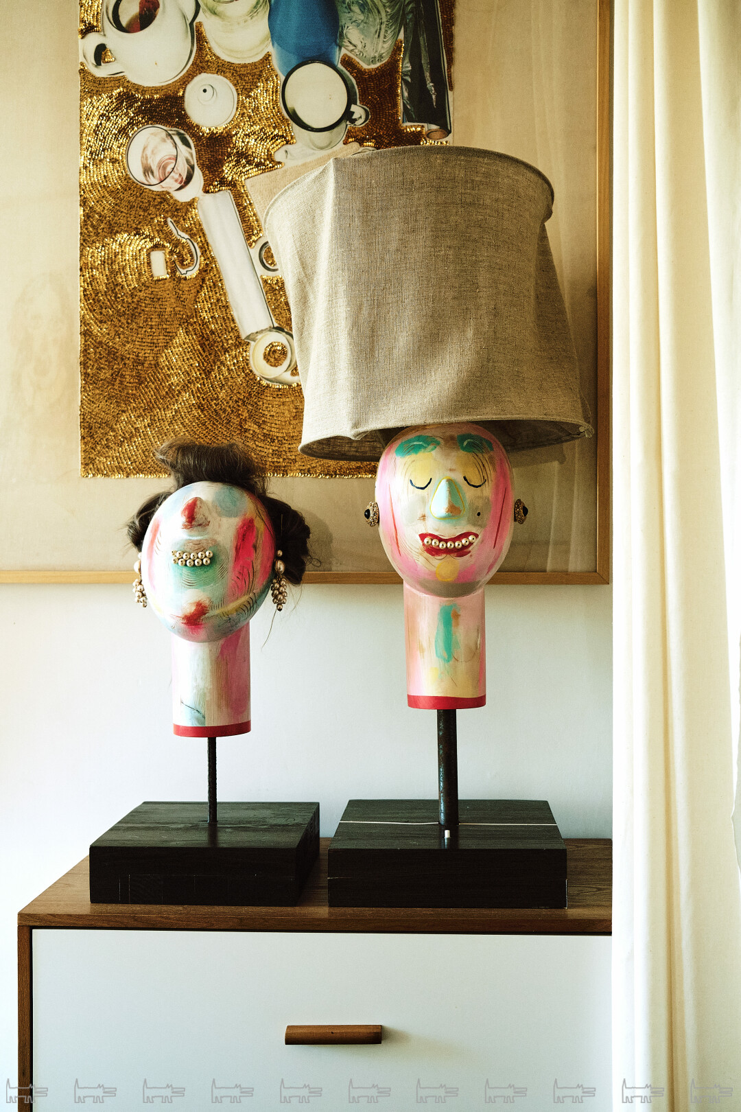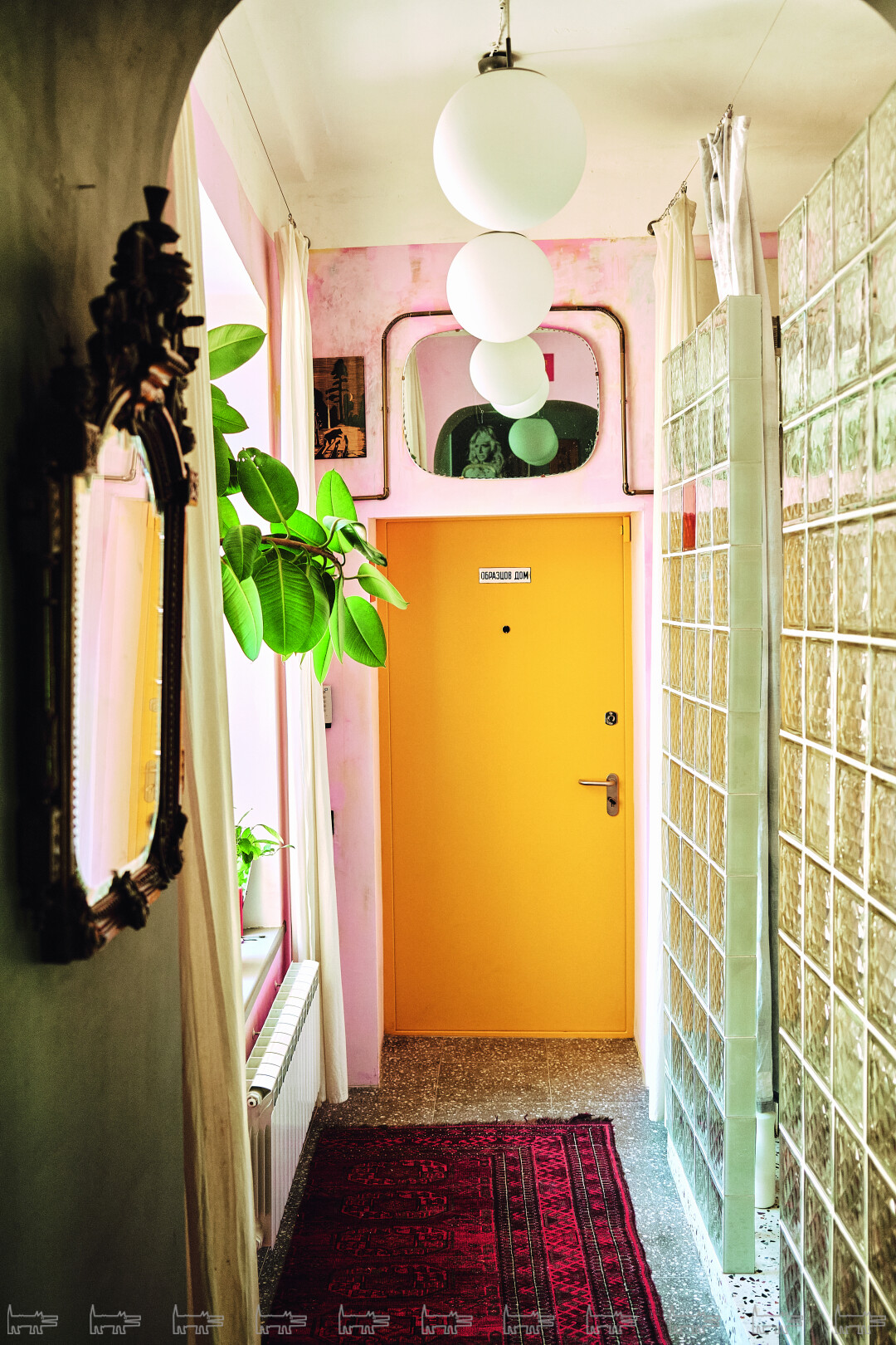 При этом пространство задумано как рама для моей коллекции — и собственных работ, и вещей других художников. Мне было нужно минималистичное решение в скандинавском стиле — доминирующий белый цвет, но оригинальные детали: например, отделка окон панелями из фанеры и шпона, деревянные вставки, таблички из эмали, стеклоблоки, дубовый паркет и плитка-терраццо с мраморными камушками, как это и было принято в советских ДК. Модерновый ковер с символикой московской Олимпиады 1980 года произведен в какой-то из бывших союзных республик и найден, разумеется, на «Авито».