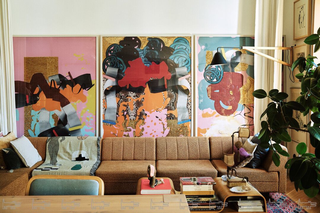 Но конечно, квартира, в первую очередь, галерея моих работ — я часто приглашаю в гости коллекционеров. Здесь есть мои работы из эпохи увлечения модой, например, сложное вышитое вручную пайетками панно «Первое свидание» и доминанта гостиной — огромный триптих «Змеи» 2016 года, на который ушло 200 часов ручного труда моих вышивальщиц.