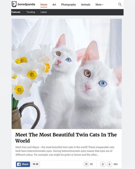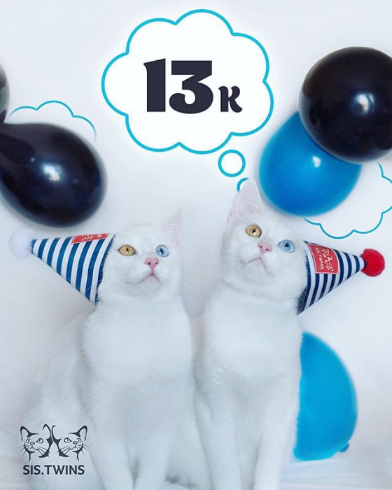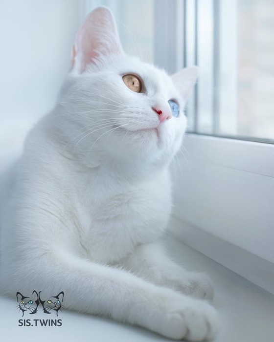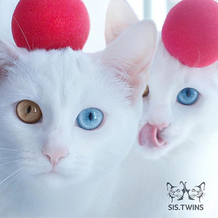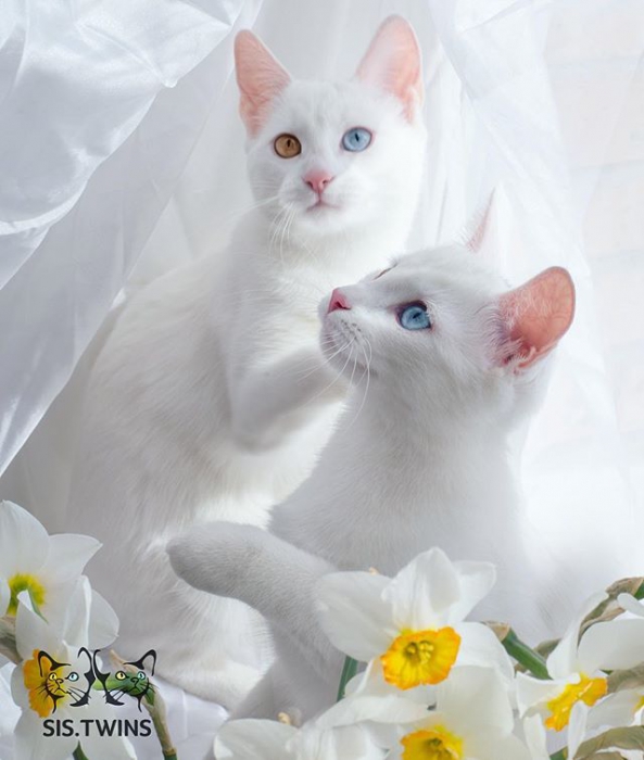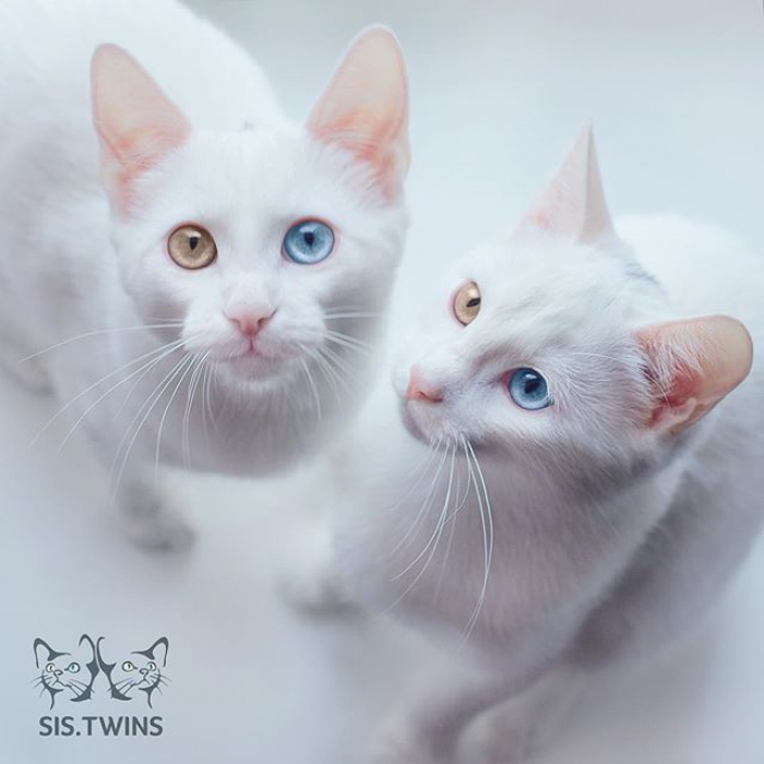 Популярность кошек-близнецов вызвал интересный цвет глаз: у обеих они разноцветные. Один — зеленый, а другой — голубой. Согласно легенде, такая гетерохромия позволяет людям и животным видеть в мире живых и мертвых. Этого мы проверить не можем, но точно знаем, что это самая обаятельная парочка на свете.