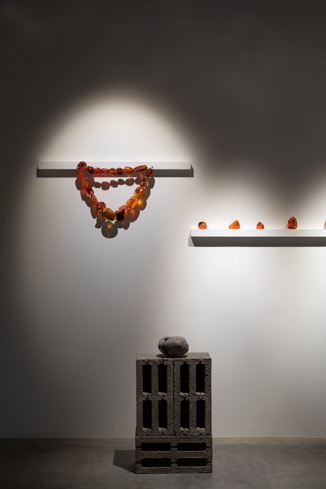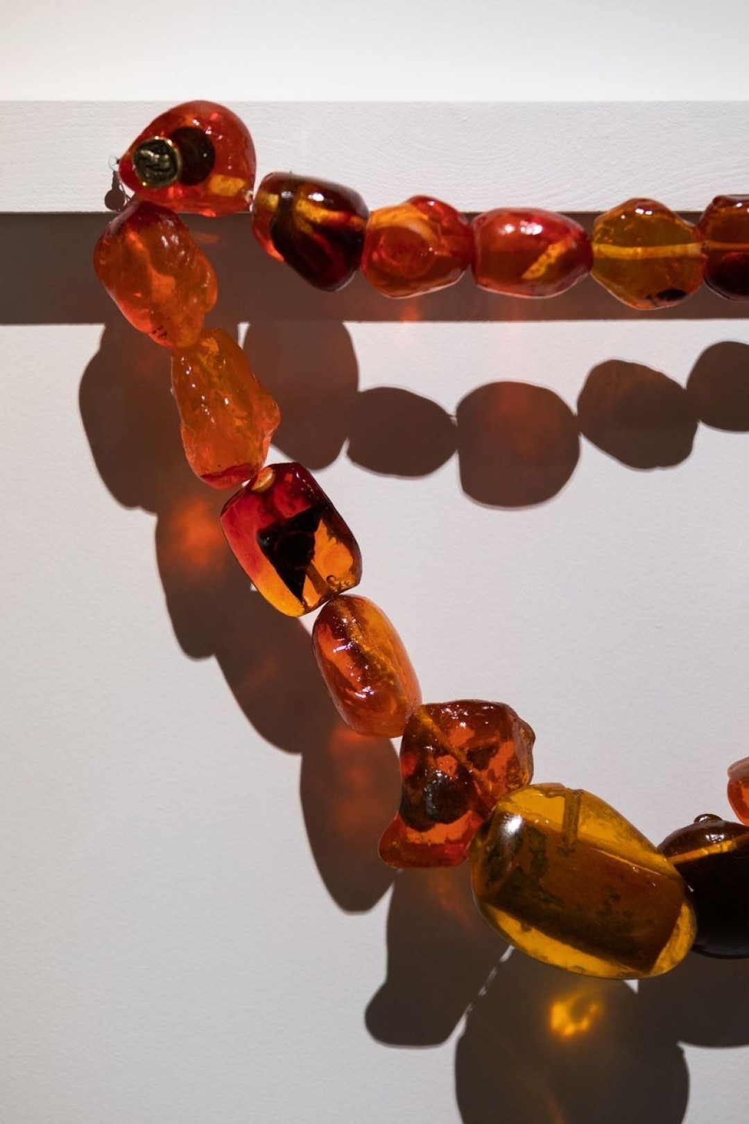 К особенностям современного мира относится и работа Маяны Насыбулловой «Актуальный янтарь». Эта смола – хранитель многолетней информации. В ней находят застывших насекомых и растений. Древние люди верили в магическое свойство янтаря и украшали им предметы одежды. Художница проводит параллель с современной памятью, которая из-за обилия информации фиксирует только избранные моменты.