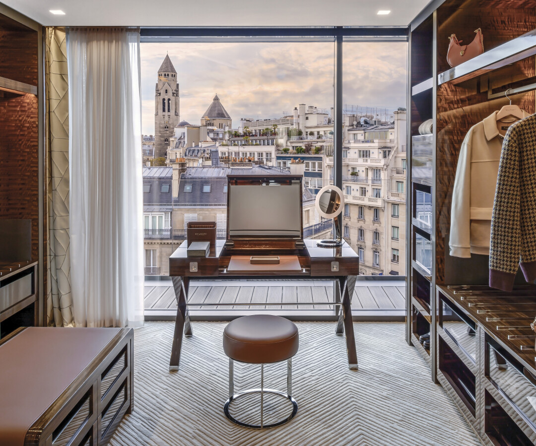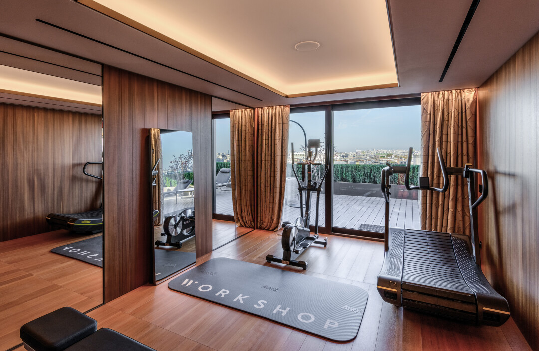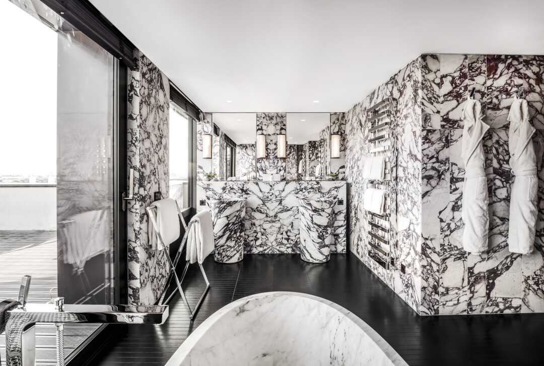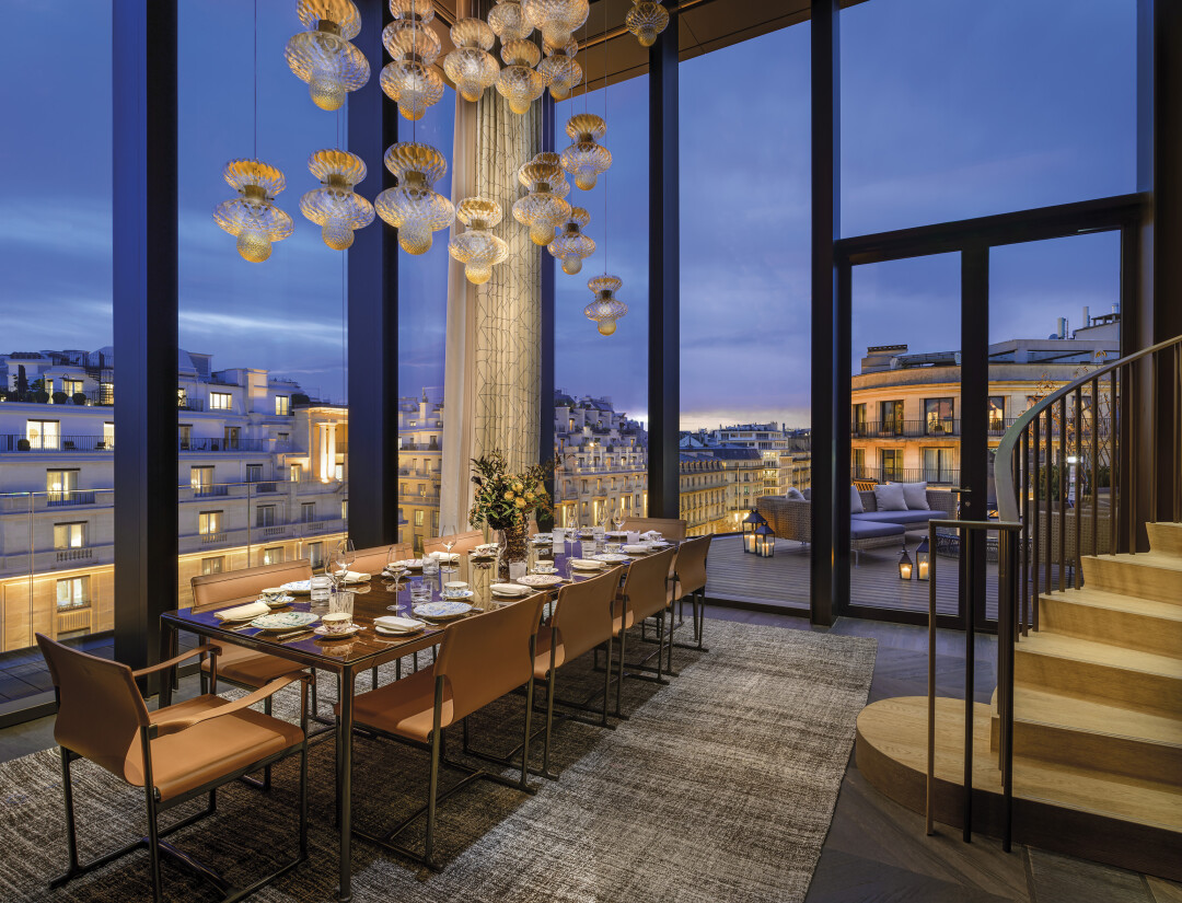 Пентхаус отеля расположен на двух уровнях, а продолжается пейзажным висячим садом со средиземноморскими растениями и фруктовыми деревьями. Кроме того, из номера открывается панорамный вид на знаковую архитектуру Парижа.