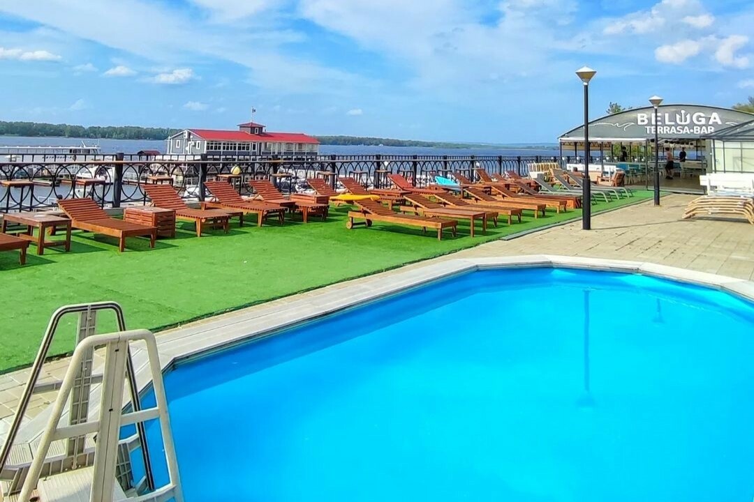 Еще один вариант для тех, кто хочет купаться в чистой воде, но при этом любоваться на Волгу. Beluga уже много лет предлагает небольшую аквазону с бассейном, деревянными шезлонгами, зонтиками, душем и раздевалками. Главное преимущество, пожалуй, в том, что официанты и ресторан обслуживают территорию аквазоны — можно заказывать блюда прямо «к бортику».