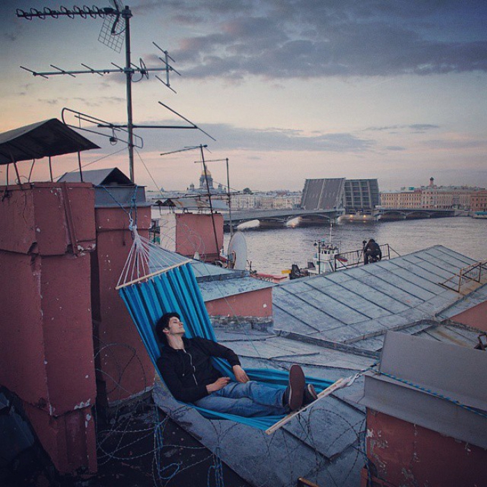 Слово «руфер» уже приобрело негативный оттенок, поэтому ни с собой, ни со своими знакомыми его не ассоциирую. Встречи наверху — обычное дело, особенно в летнее время. Важно за общением не пропустить удачный свет и найти свой ракурс».