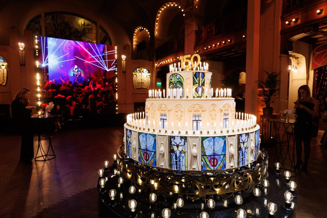 После официальных поздравлений оркестр из сотрудников и профессиональных музыкантов ( солистом стал шеф-повар Денис Соболев!) исполнил «Симфонию Европы». Не менее эффектно появился именинный торт со 150 свечами и изображениями исторических витражей.
