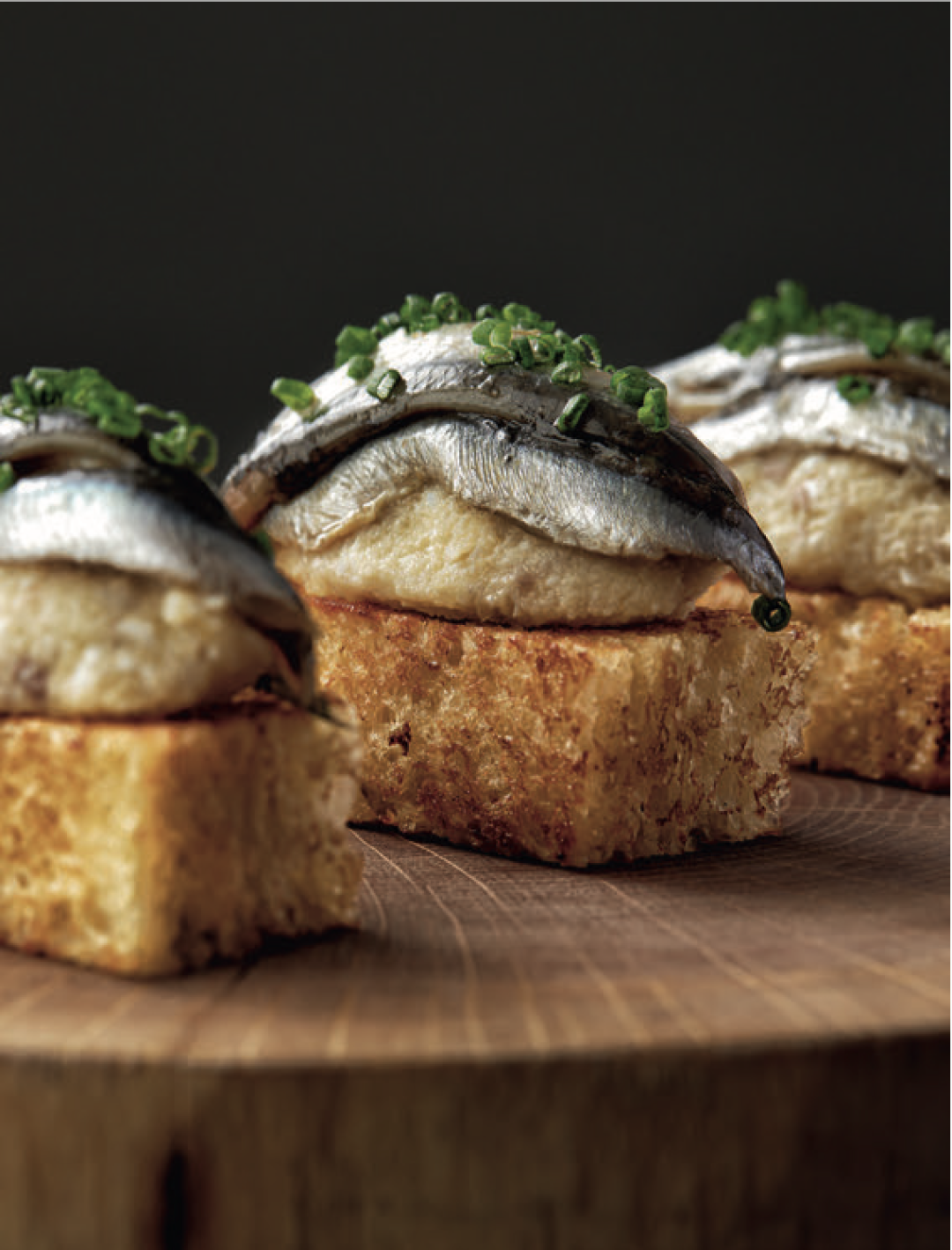 Готовый форшмак подаем в виде кнелей на обжаренной бриоши. Бриошь обязательно должна быть теплая. На каждую кнель выкладываем подготовленную хамсу, сверху посыпаем луком сибулет.