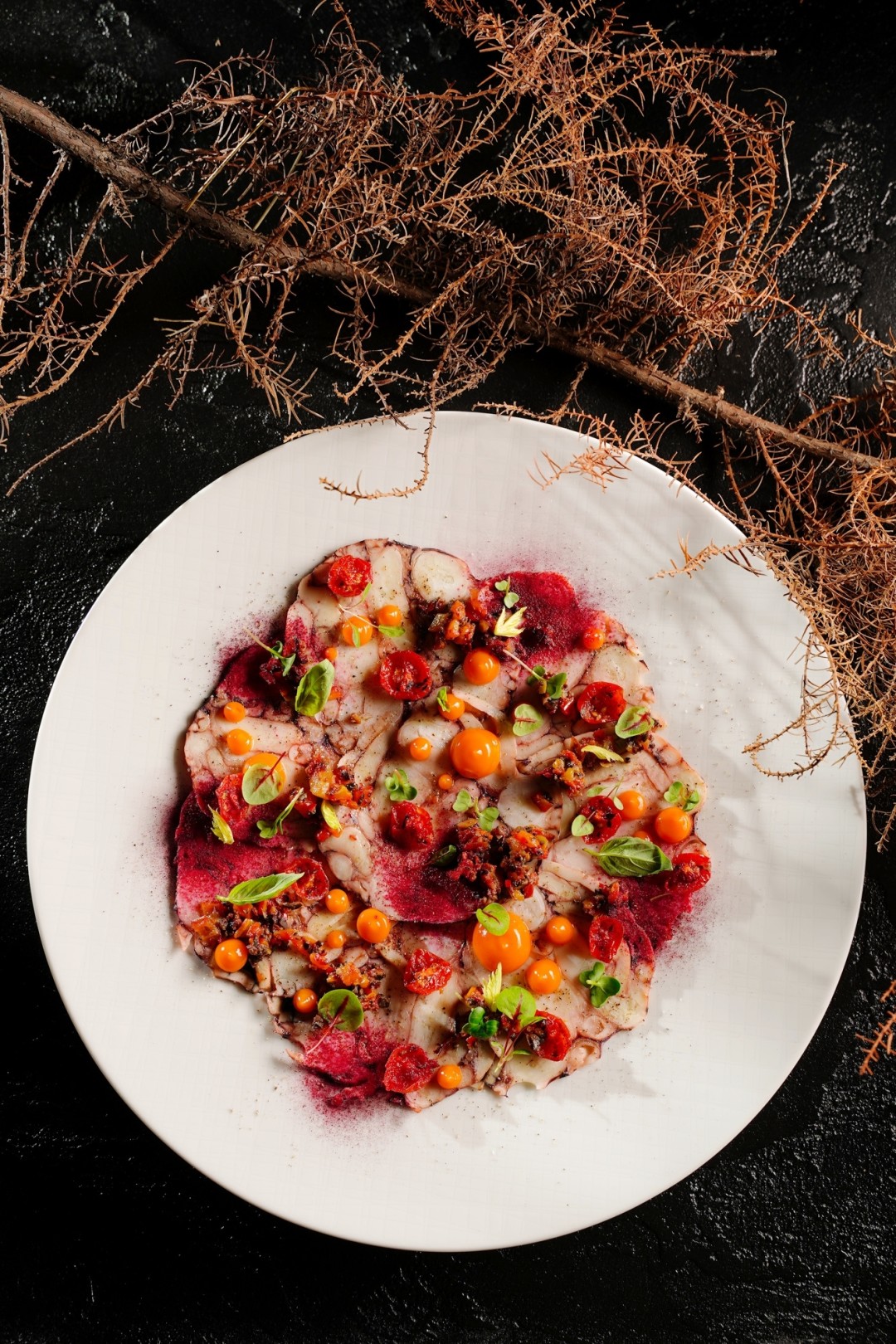 На тарелку с тонко нарезанным осьминогом добавляем вяленые черри, хаотично раскидываем тапенад из корнишонов с болгарским перцем и точечно выкладываем соус из облепихи.