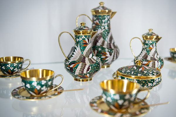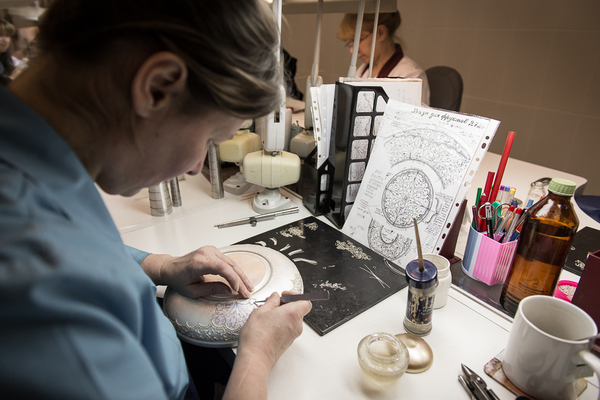 Помимо украшений, «Самоцветы» известны своей эмалево-филигранной посудой. Филигрань – особая ювелирная техника плетения узора из тонкой золотой или серебряной проволоки. Вначале серебро обжигают открытым огнем при температуре 700 градусов – это делает поверхность матовой и рисунок становится виднее. Узор выкладывается фигурной проволкой согласно эскизу, закрепляется клеем и посыпается припоем, который при обжиге, когда выгорает клей, намертво припаивает его к изделию.