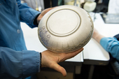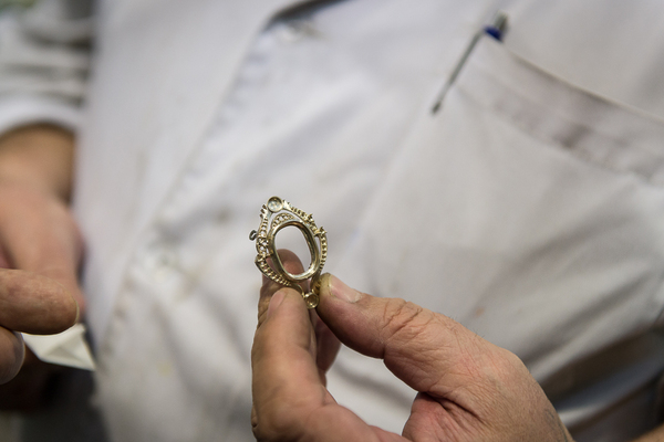 На механическом участке работают полуавтоматические станки, которые штампуют изделия на прессе. В гидравлическом, например, больше усилия, зато работает он медленнее. Хотя на оттиск одного предмета требуется меньше минуты. На токарном станке делают объемные предметы, например, чашки. Металлическую пластину нагревают до определенной температуры, а потом специальным инструментом вдавливается нужная форма. Когда украшение готово, его обтачивают ювелиры, сглаживая неровные края.