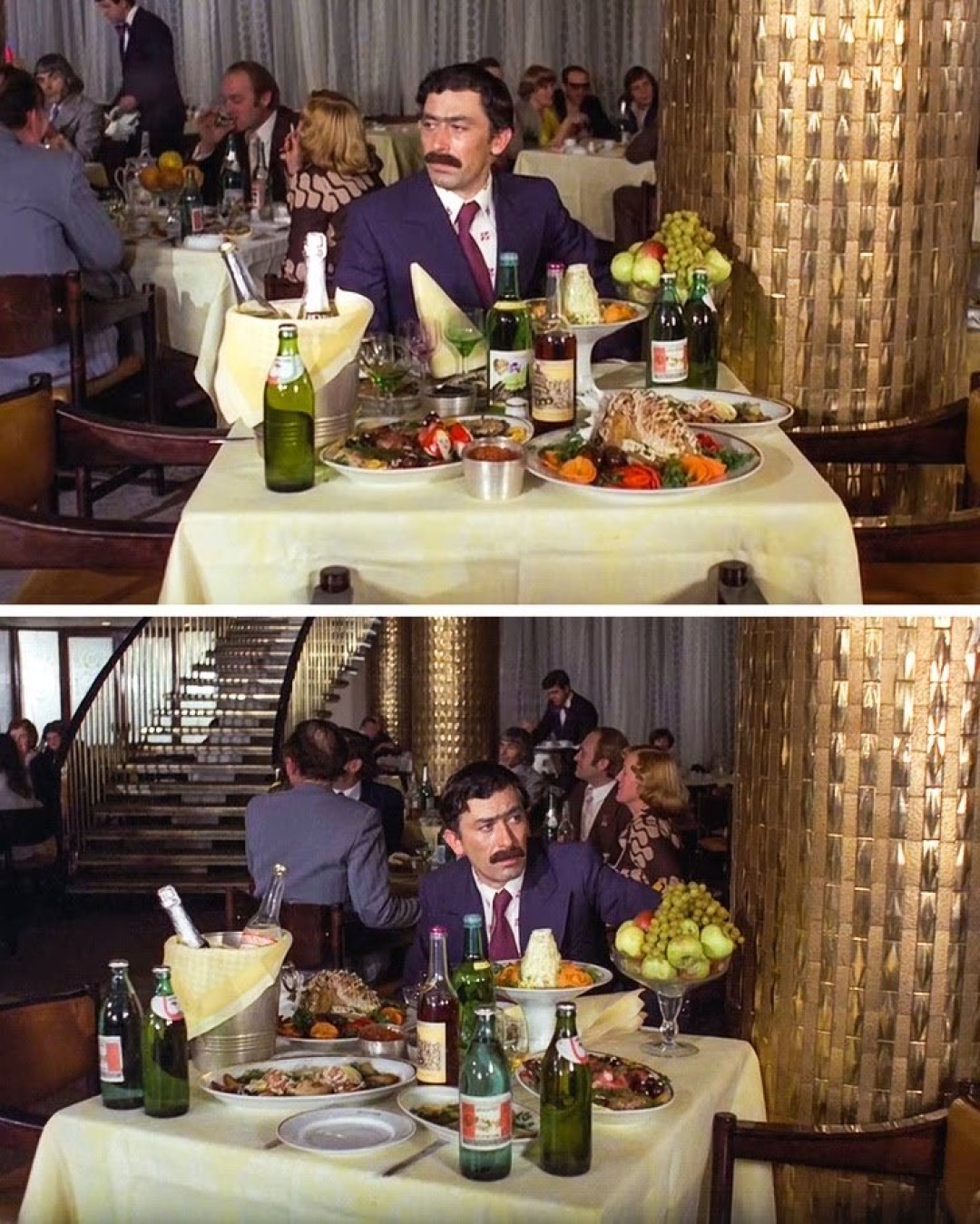 Расположение блюд и бутылок на столике заметно различается. Хотя между кадрами прошло всего несколько секунд.