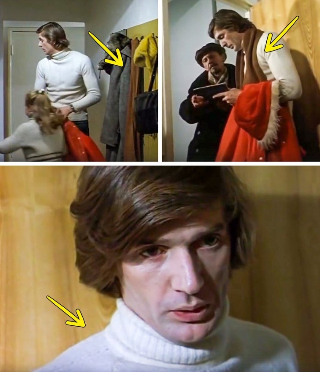 Костик пришел на свидание в черном пиджаке с белым воротом и манжетами, а в следующих кадрах пиджак становится коричневым и появляется галстук.