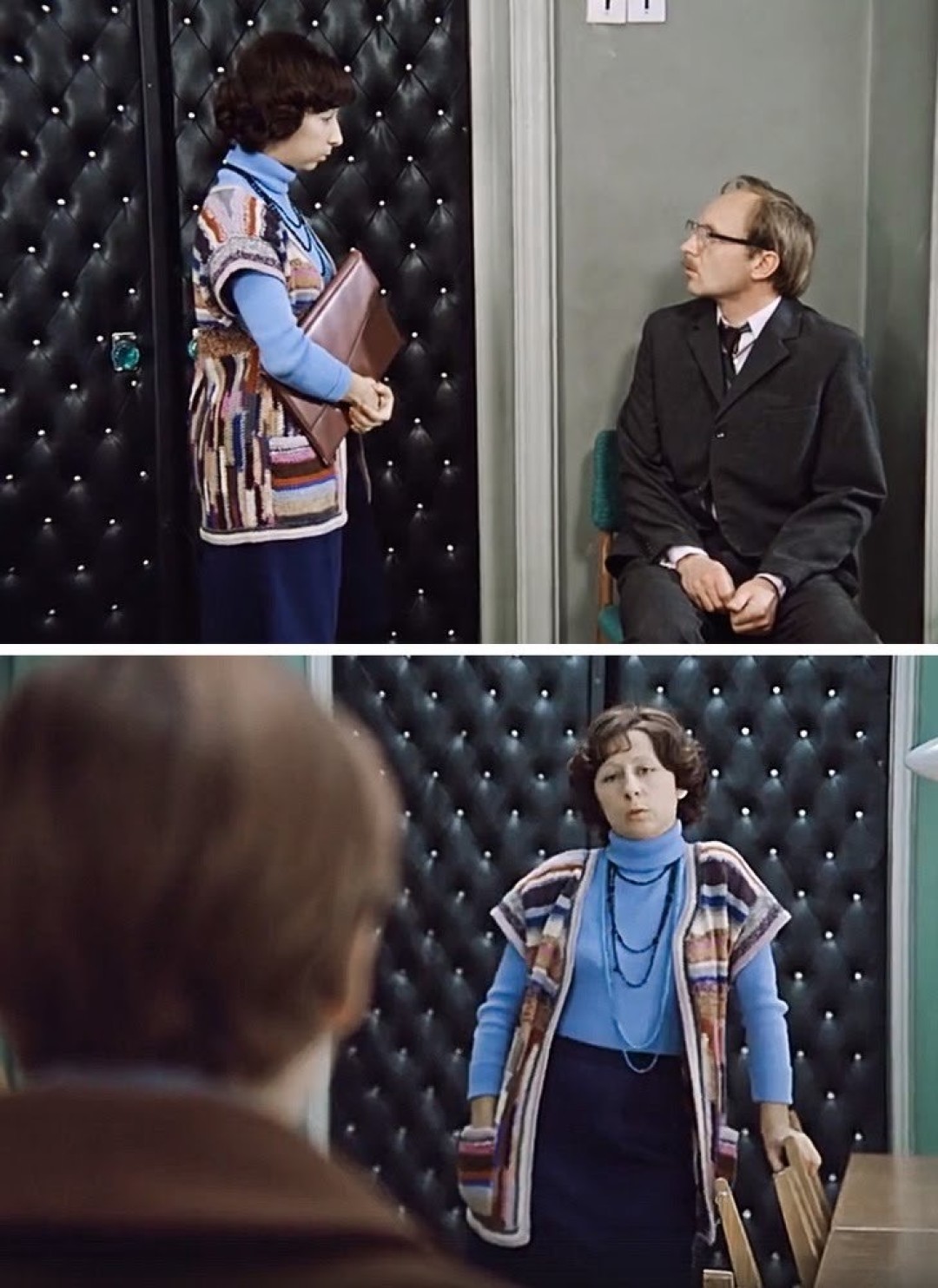 Разговаривая с Новосельцевым, Верочка держит в руках коричневую папку. В кабинет она входит с ней же, но через секунду стоит перед Калугиной с пустыми руками.