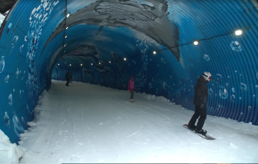Целый подводный мир можно увидеть в горах Сочи. Необычный подарок любителям горных лыж и сноуборда в новом зимнем сезоне преподнес курорт «Роза Хутор». Удивительный «океанариум» появился на высоте 1600 метров, благодаря краснодарским художникам из команды Stenaclub и 1500 баллонам краски. В тоннеле площадью 670 квадратных метров теперь живут дельфины, медузы, стаи барабулек, морской котик и гигантский кит.