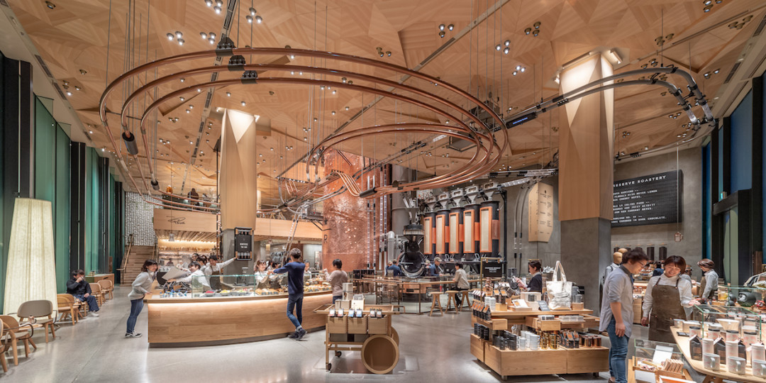 Японский архитектор Кенго Кума создал для компании Starbucks кофейню в Токио, выбрав для нее четырехэтажное здание с деревянными балконами. А за создание интерьера отвечала главный дизайнер Starbucks – Лиз Мюллер. В отделке помещений использованы породы светлого дерева, потолок украшен геометрическими плитами, напоминающими фигурки оригами и цветы сакуры, чтобы создать у посетителей максимально театральное впечатление. Посреди кофейни расположена самая высокая медная кофейная бочка в истории Starbucks — она проходит сквозь все четыре этажа заведения и достигает 16 метров в высоту