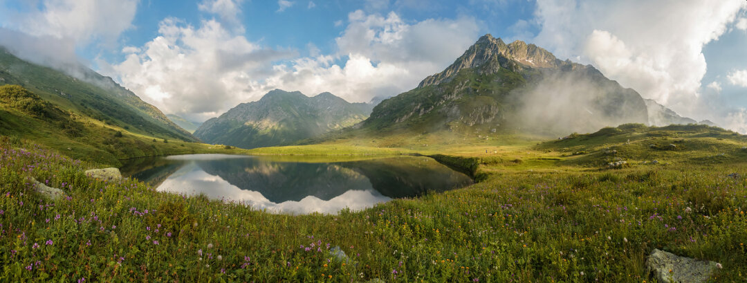 Высоко в горах находятся озера Хмелевского — зеркальные водоемы, окруженные луговыми цветами. Здесь все пронизано прозрачным воздухом и древней тишиной. В ясную погоду в воде отражаются снежные пики, а в туманные дни ландшафт будто растворяется в облаках.