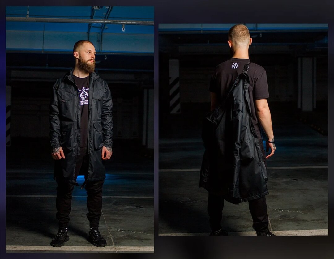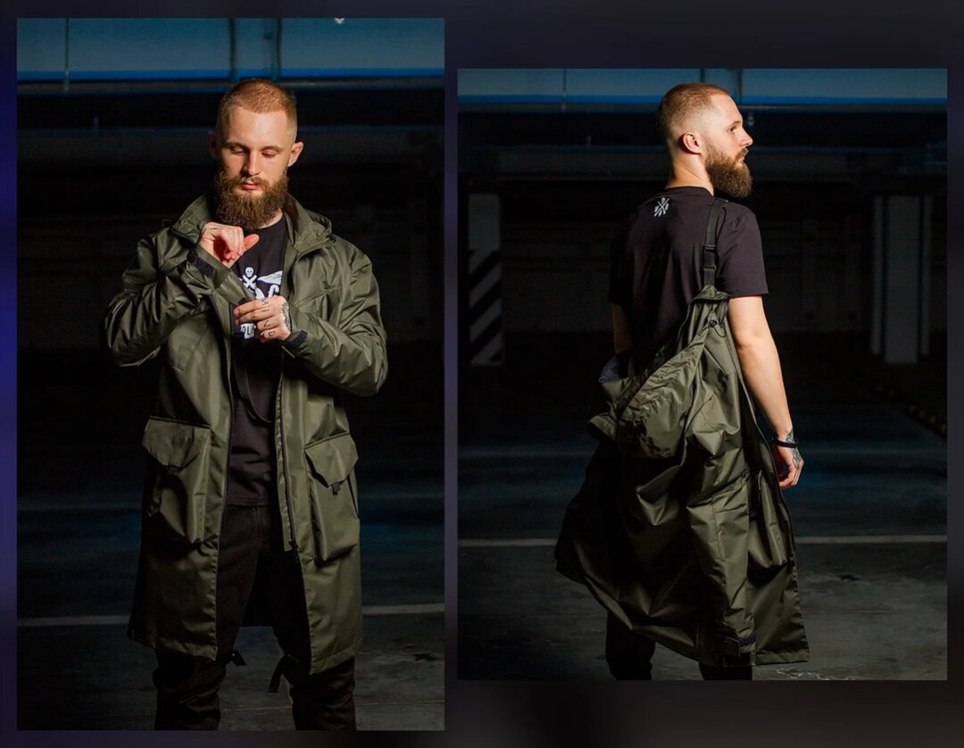 В технологичном плаще White Brothers из мембранной ткани не страшны ни дождь, ни ветер. Изделие трансформируется в куртку и имеет стропы, которые позволяют носить ее за спиной, если стало жарко.