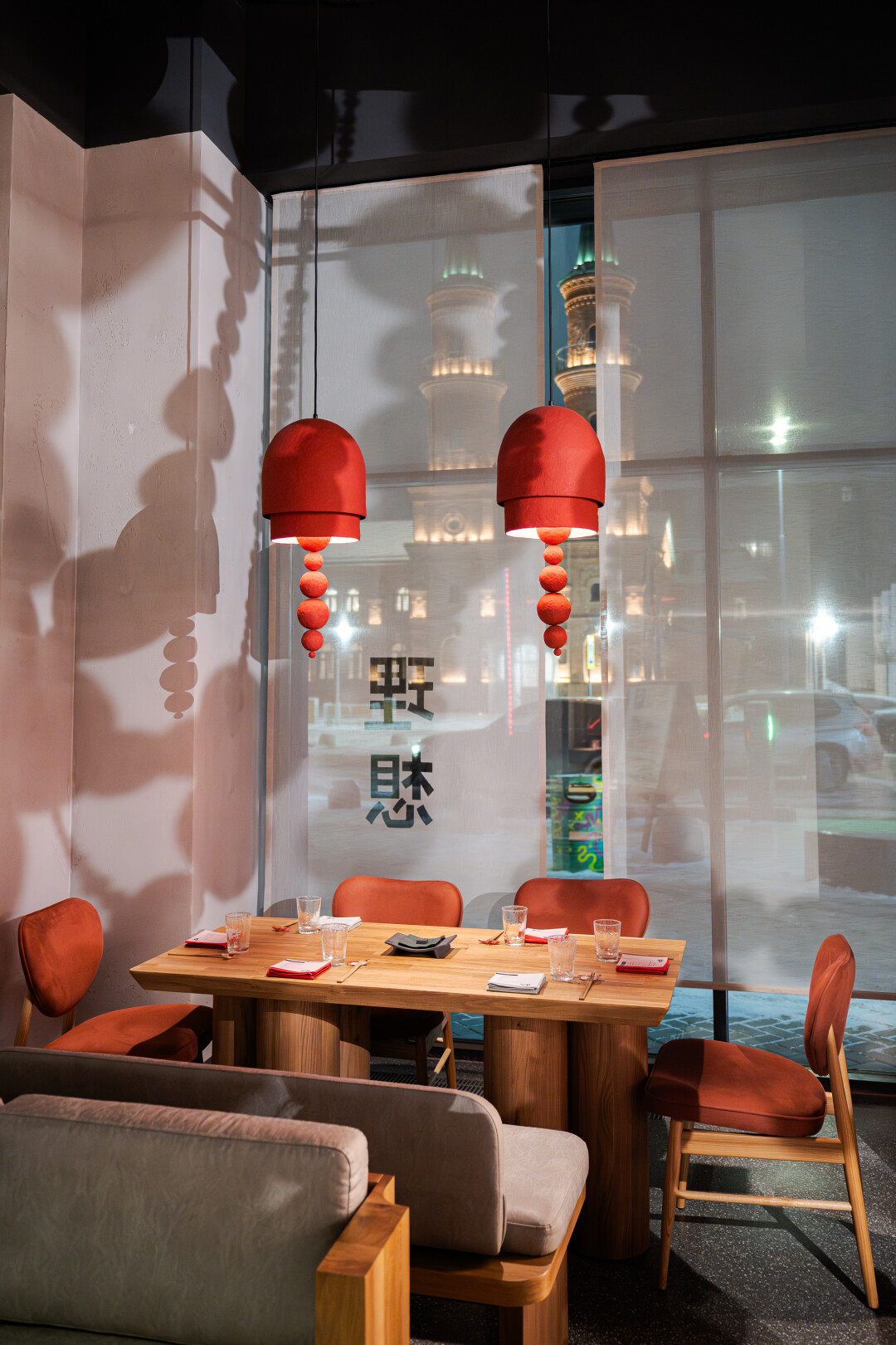 В большом зале на 90 мест все наполнено контрастами и гармонизировано теплым приглушенным светом. Главными мотивами интерьера в стиле ваби-саби стали минимализм и спокойные оттенки, соседствующие с яркими акцентами.