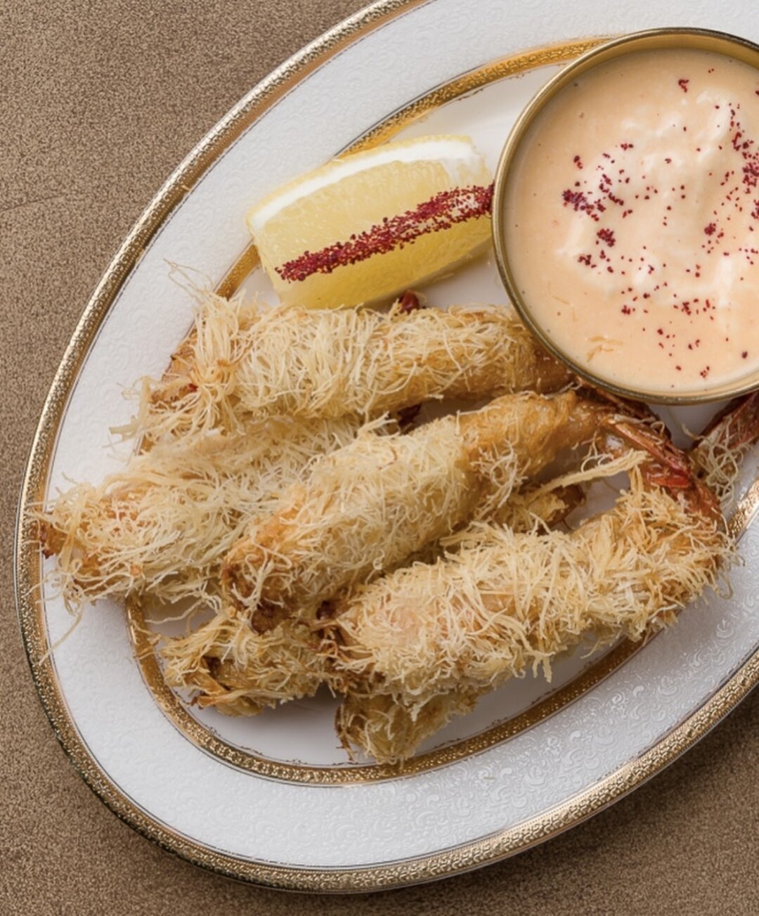 Жаренная в муке корюшка с битым картофелем, каре ягненка и креветки в тесте катаифи, которые подаются с лимоном и соусом. Все это можно попробовать на уже открывшейся летней террасе, где особенно приятно встречать вечер.