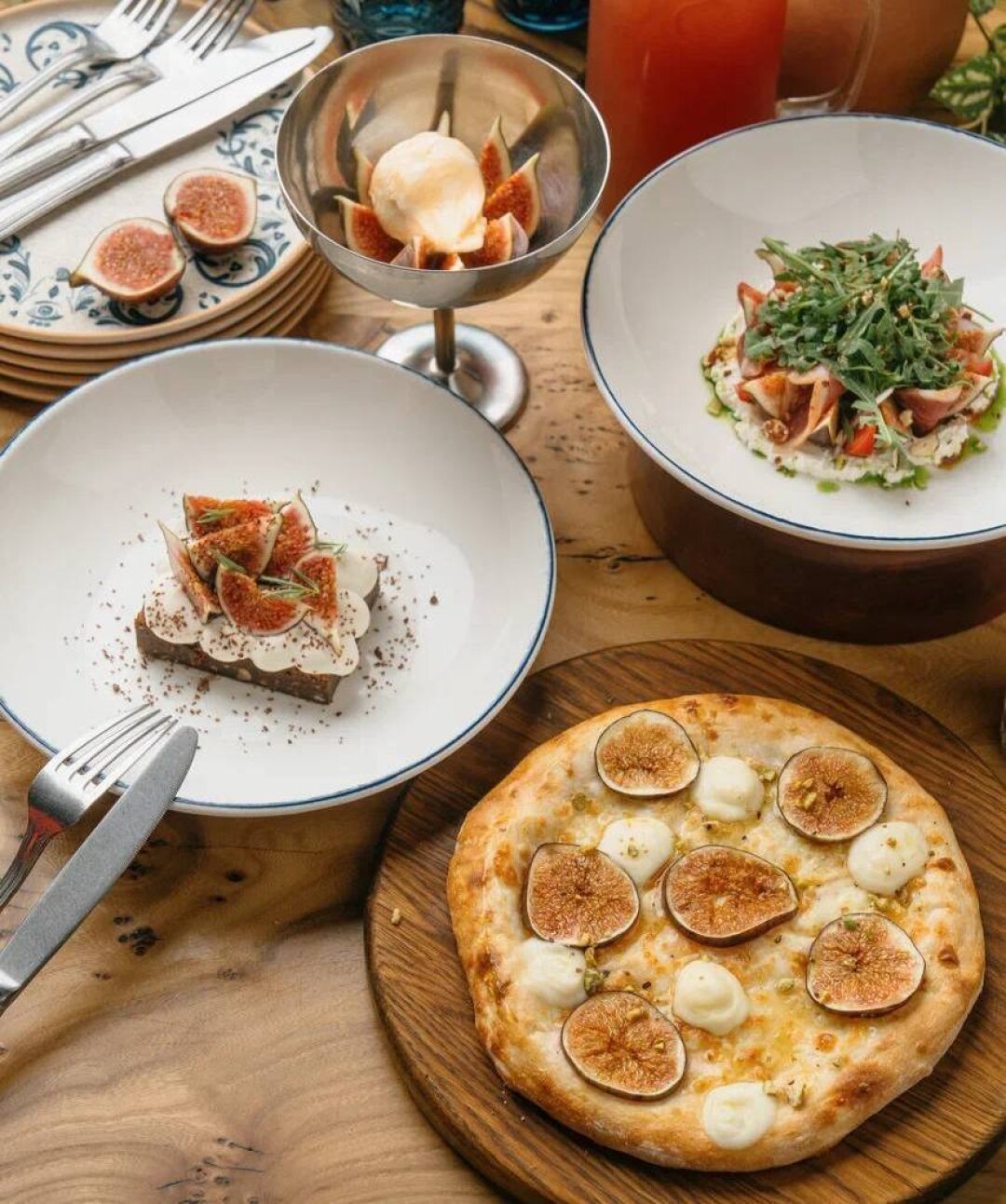 Готовьтесь покорить соцсети! Здесь запустили очень фотогеничные блюда: карпаччо из томатов и инжира, салат с инжиром и авокадо, а на десерт – тарт с дольками инжира.