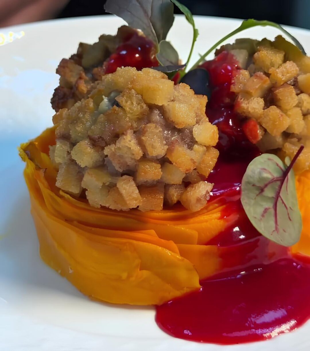 В меню сразу несколько новых позиций. Записывайте: язычки ягненка с пюре из батата и сморчками, котлеты из медвежатины с морковным гратеном, салат с хамоном из гуся, инжиром и сыром Тет де Муан.
