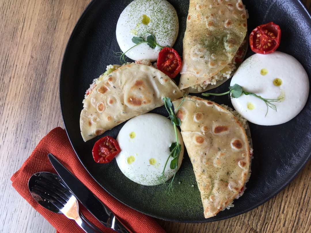 Вегетарианский ресторан создал свои вариации на тему кыстыбыя: пшено заменили кус-кусом, зелень – овощами, масло – муссом из пармезана.