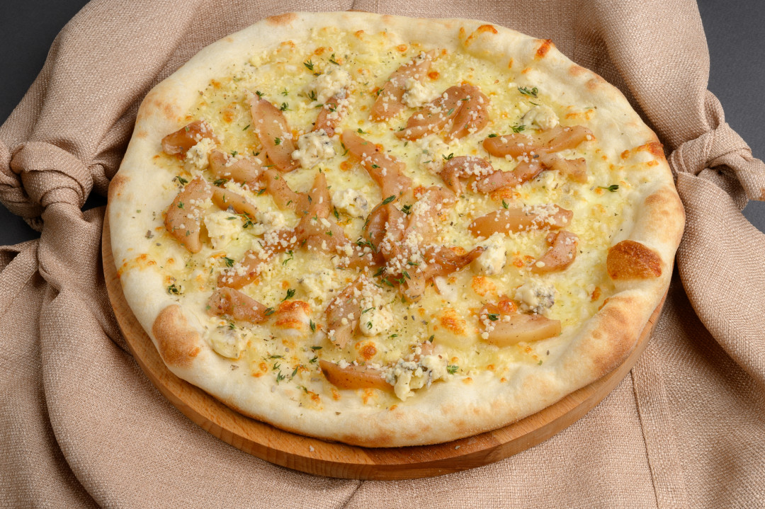 Эта итальянская пицца стала фаворитом для многих гостей благодаря нежнейшему соусу Бешамель, сыру моцарелла, а пикантности этой феерии добавил соус песто.