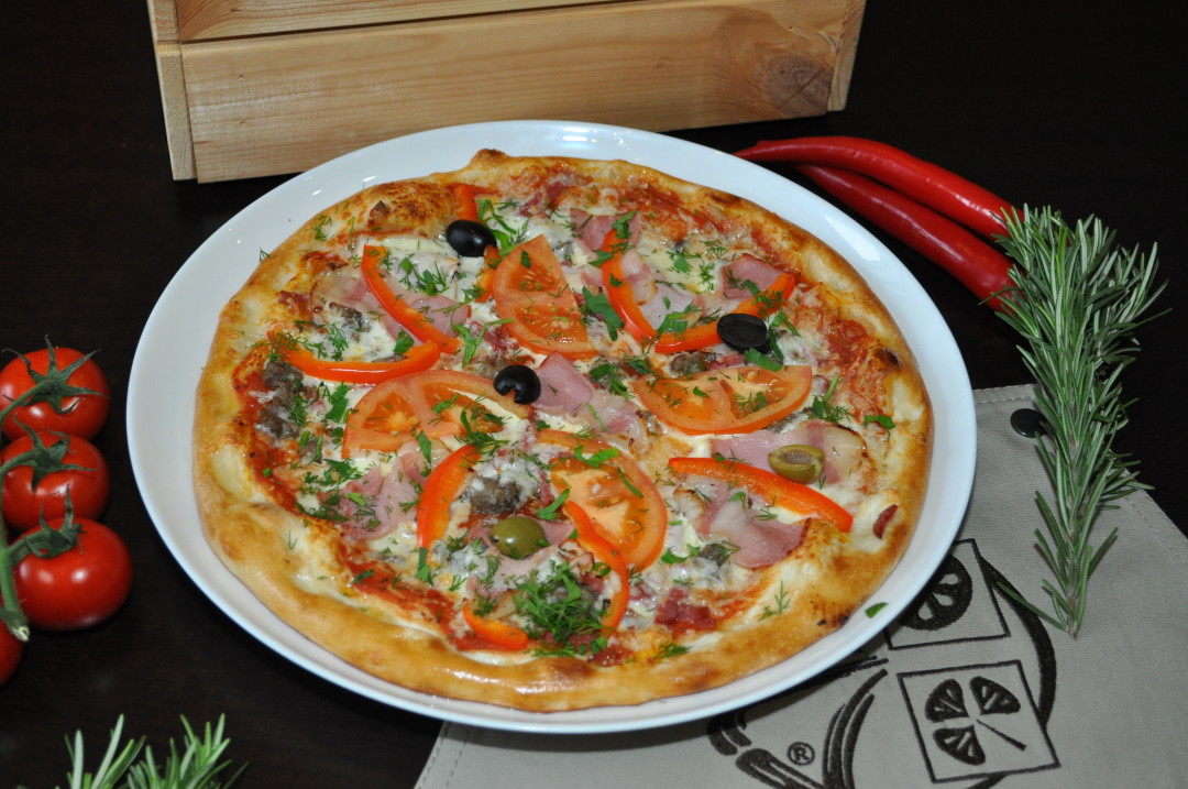 Эту пиццу гости любят за мясную начинку. В ней ломтики ветчины, салями, ароматный бекон и говяжий фарш.