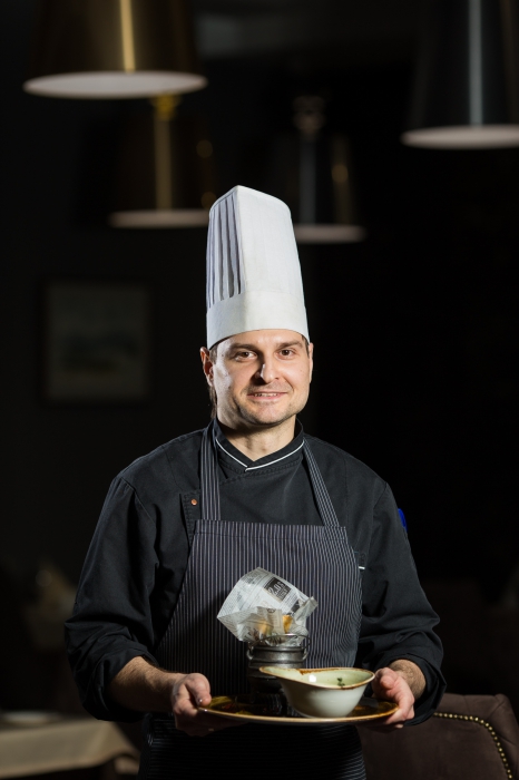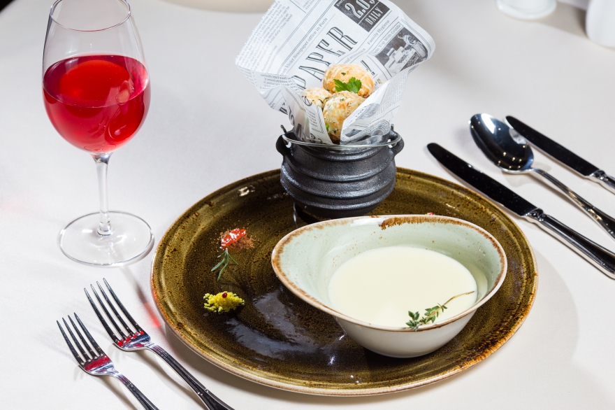 Шеф-повар ресторана гостиницы «Башкирия» Андрей Дадонов для участия в конкурсе Белебеевского молочного комбината нежнейший сырный крем-суп с сырно-чесночным Bomb (с сырами Belster  и Belfor).