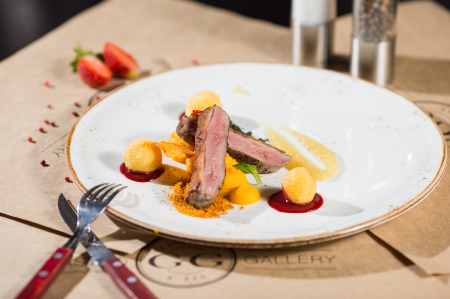 Филе утиной грудки с клубнично-базиликовым соусом, пюре из айвы, сырными крокетами и ореховой землей