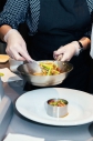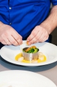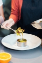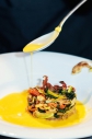 Подача: через кольцо выкладываем обжаренные цуккини и томаты, вокруг на соус выкладываем обжаренные гребешки.