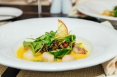Делимся с вами рецептом приготовления морских гребешков Сен-Жак с цуккини, вялеными томатами и соусом из маракуйи.