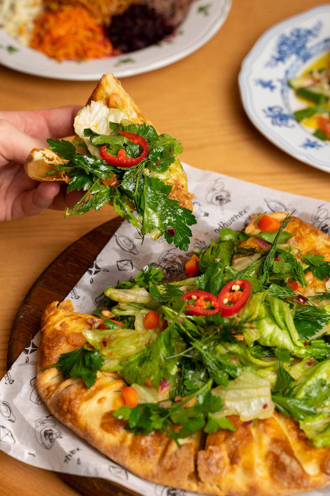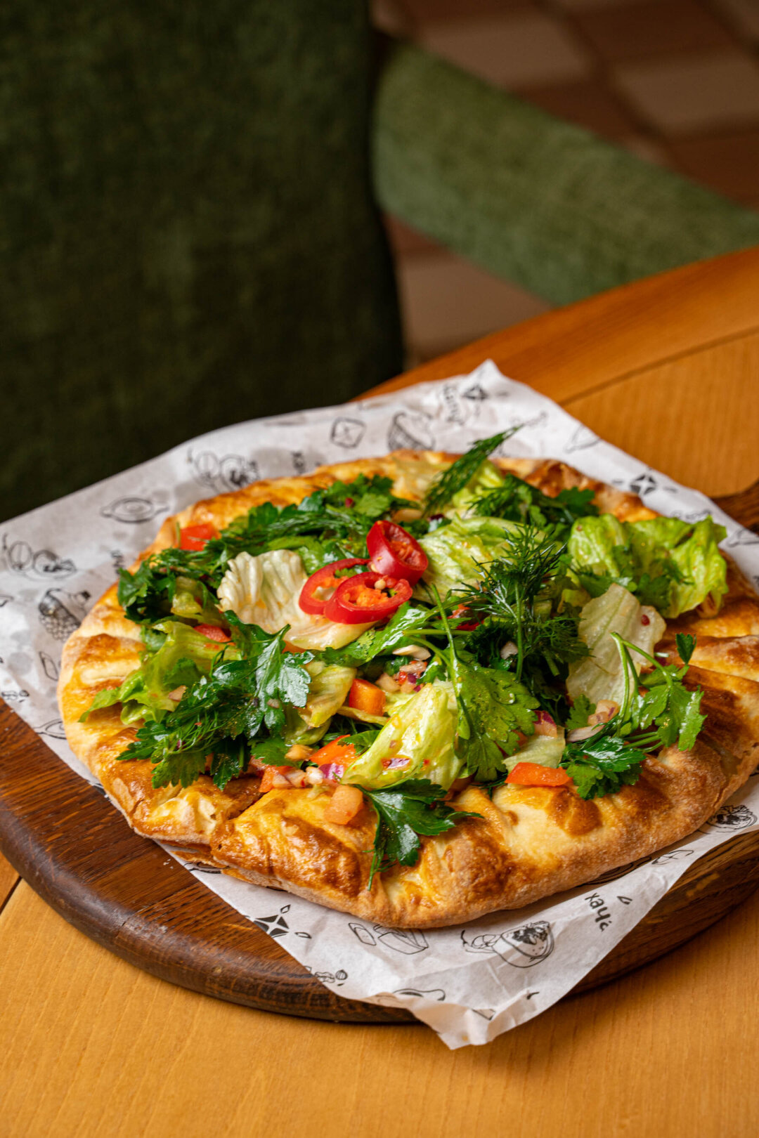 В меню (хинкали и хачапури – само собой!): цицила тапака (курица, которую готовят в Грузии на праздники), жаркое по-чкмерски, семга по-гурийски и много других блюд. Специи привозят из Грузии, а сванская соль смешивается с травами прямо в ресторане.