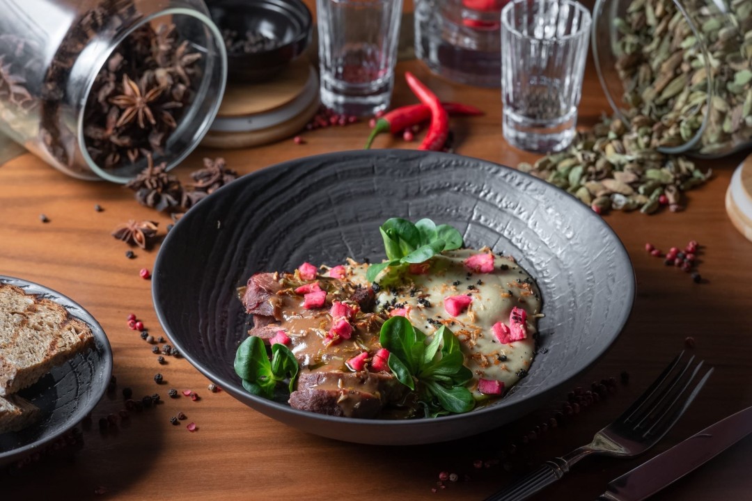 Попробовать жаркое из дичи в мегаполисе – сам по себе экспириенс. А если это блюдо в авторском исполнении, получается вдвойне необычно. В «Холодце» косулю готовят с соусами из баклажана и трюфеля, попкорном из киноа, сливками и зеленью. На гарнир подают картофель. Получается скорее изысканно: не ужин в домике охотника, но гастрономическое приключение.