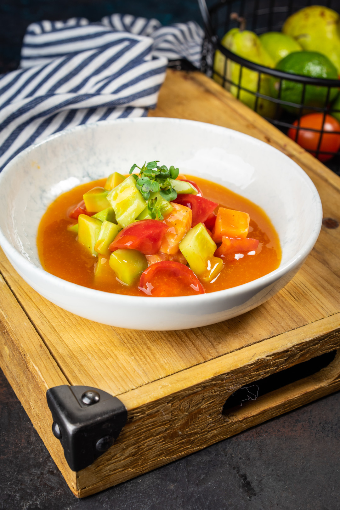 «Тема» – это прежде всего вечеринки. Но, как и во всех заведениях Leader Group, здесь достойная кухня. Севиче на основе лосося вполне может стать стартером для веселого вечера пятницы. Ингредиенты – томаты и огурцы конкассе, кинза, зеленое масло и соус манго-маракуйя.