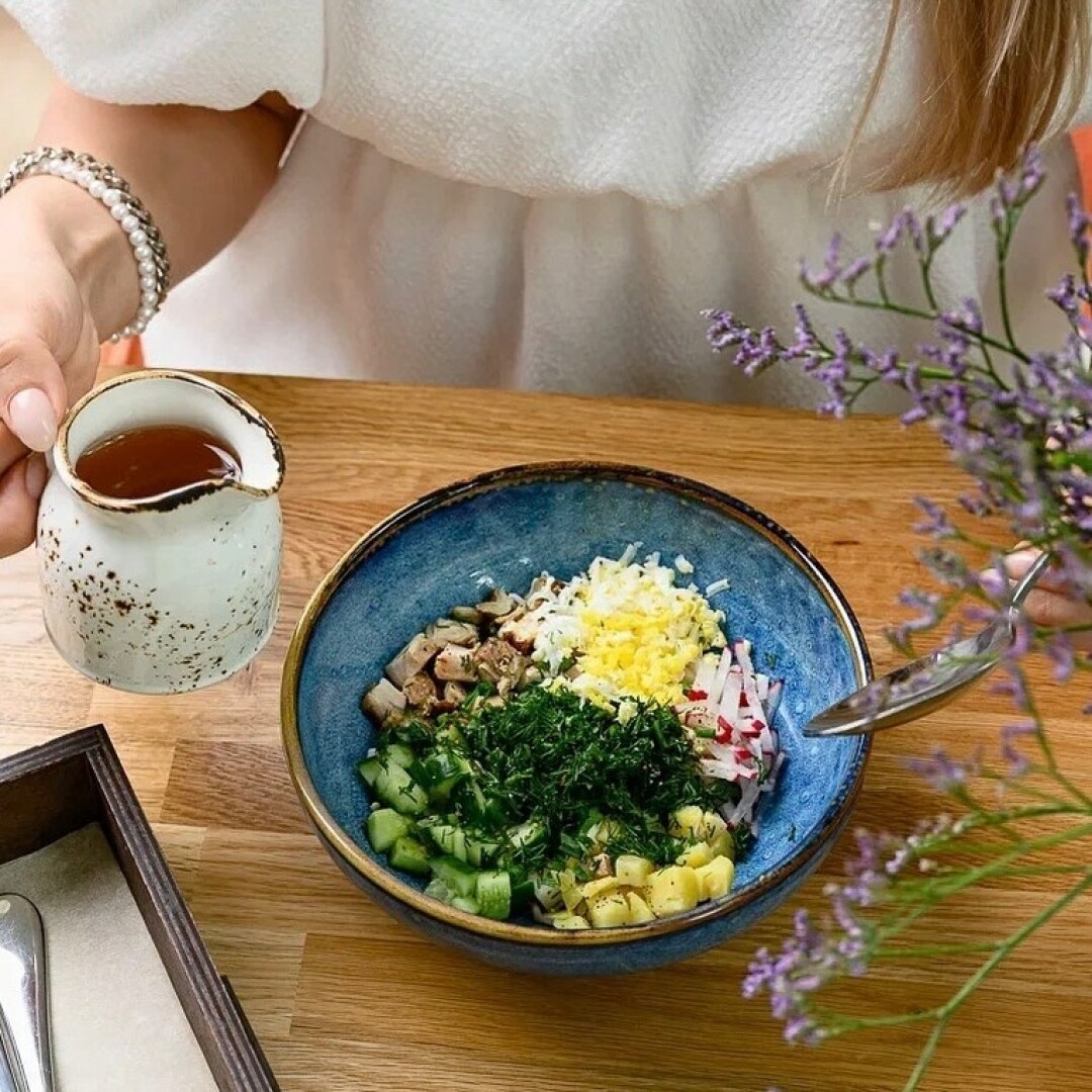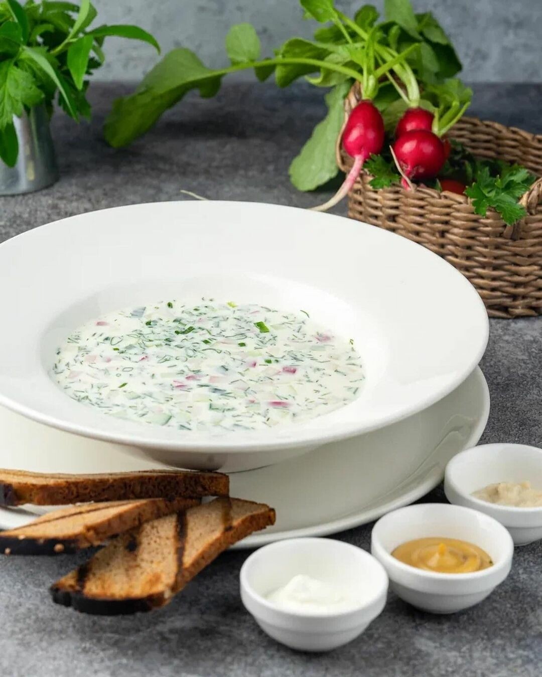 Тут не жалеют зелени и это определенно плюс: вкус такой, будто вы обедаете у бабушки на даче, а после собираетесь весь день валяться в гамаке с книгой. В остальном все стандартно: кефир или квас, сметана или горчица – выбор за вами.