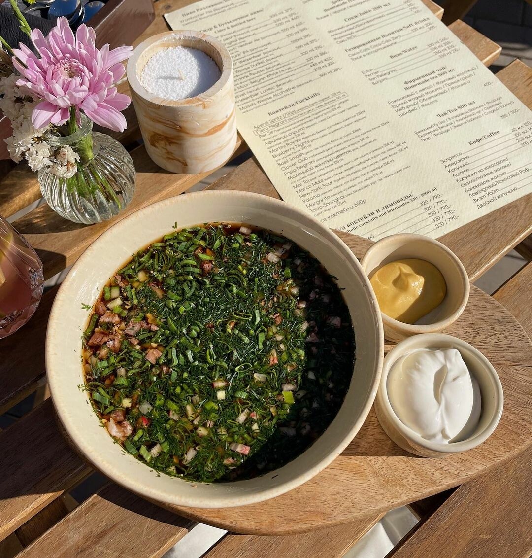 Здесь вас ждет классика жанра: окрошка на квасе с разварной говядиной. А если хочется чего-то эдакого, берите тбилисский летний суп на мацони.