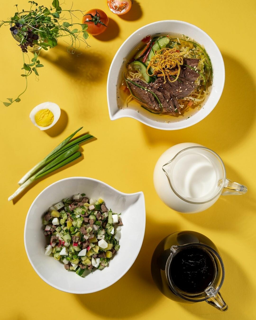 В меню лаунж-кафе вы найдете два вида окрошки – для мясоедов и вегетарианцев. Оба можно заказать на квасе и на кефире.