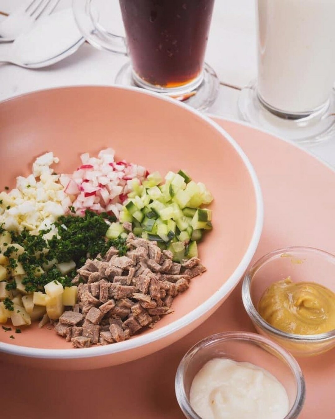 Еще одно место с приятным ценником: за гуманные деньги вам нальют большую тарелку окрошки на квасе с курицей и говядиной. В качестве соуса предлагают горчицу и хрен.