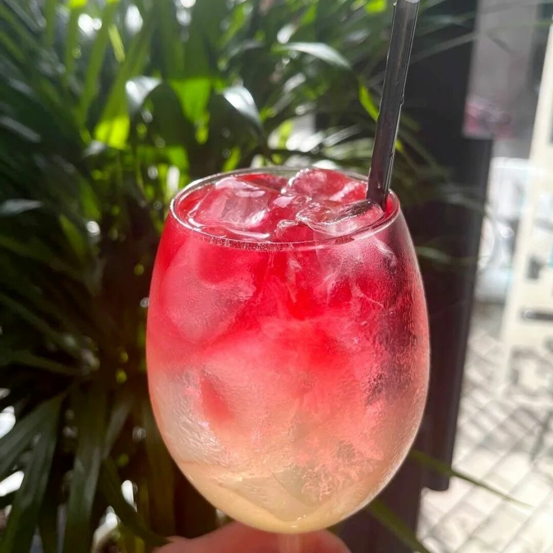 Любимчика летних веранд – апероль – здесь решили усовершенствовать. Получился он: коктейль на основе игристого и джина с клубничным сиропом и яблочным соком. Ярко, вкусно, охлаждающе.