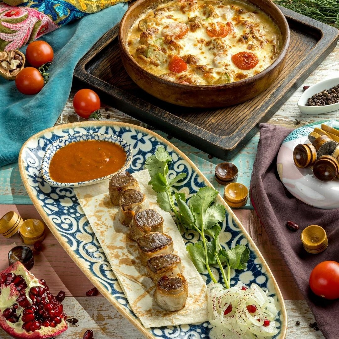 Действительно богатое предложение: целая серия блюд с восточным вайбом. Чтобы мысленно перенестись в Стамбул, берите салат гавюр со свежими томатами, булгуром и кедровыми орехами и шаш по-бухарски – сочную говяжью вырезку в курдюке.